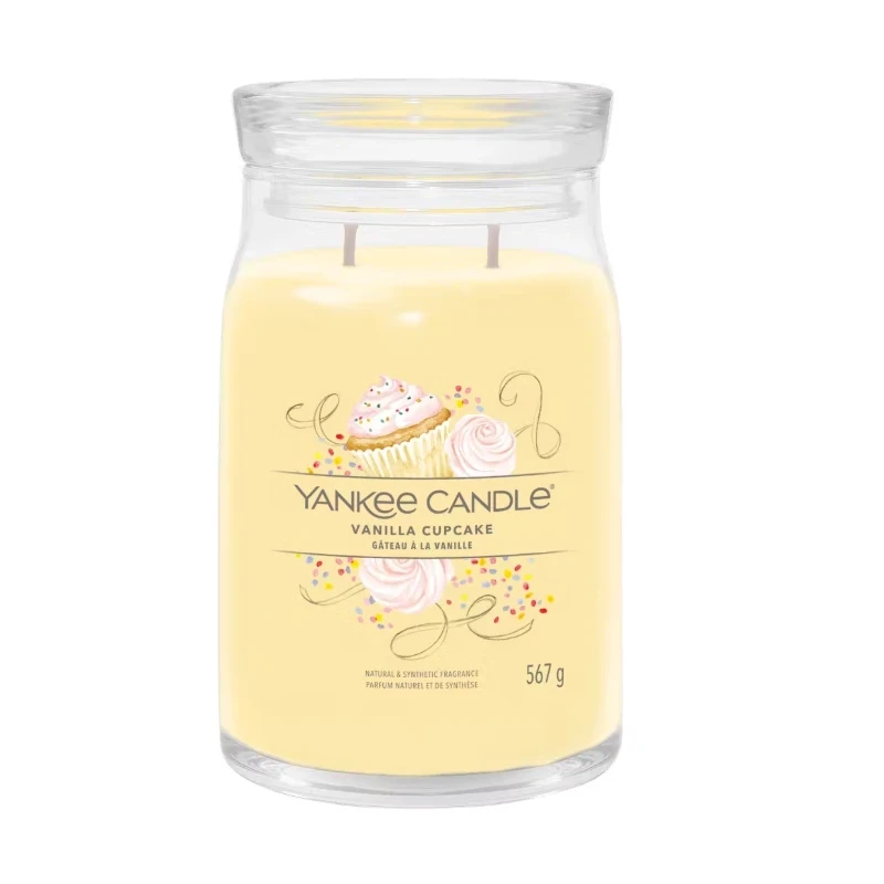 Yankee Candle's Vanilla Cupcake is a large jar candle that makes your mouth water just by smelling it: the intense scent of freshly baked cupcakes wafts through the air, enveloping the senses with the creamy aroma of vanilla and a bright touch of fresh lemon. On the surface, you can sense the unmistakable sweetness of a soft, sugary glaze, abundant and velvety, just like that of an artisan pastry shop. At the heart, notes of batter and chocolate lend a rounded, delicious texture, while the base notes reveal enveloping nuances of cocoa and vanilla bean, leaving a warm, irresistible, and deeply comforting trail in the air. Vanilla Cupcake is a sweet and spicy fragrance that transforms any space into a corner of pure delight. Perfect for those who love gourmand, cuddly scents rich in personality.
