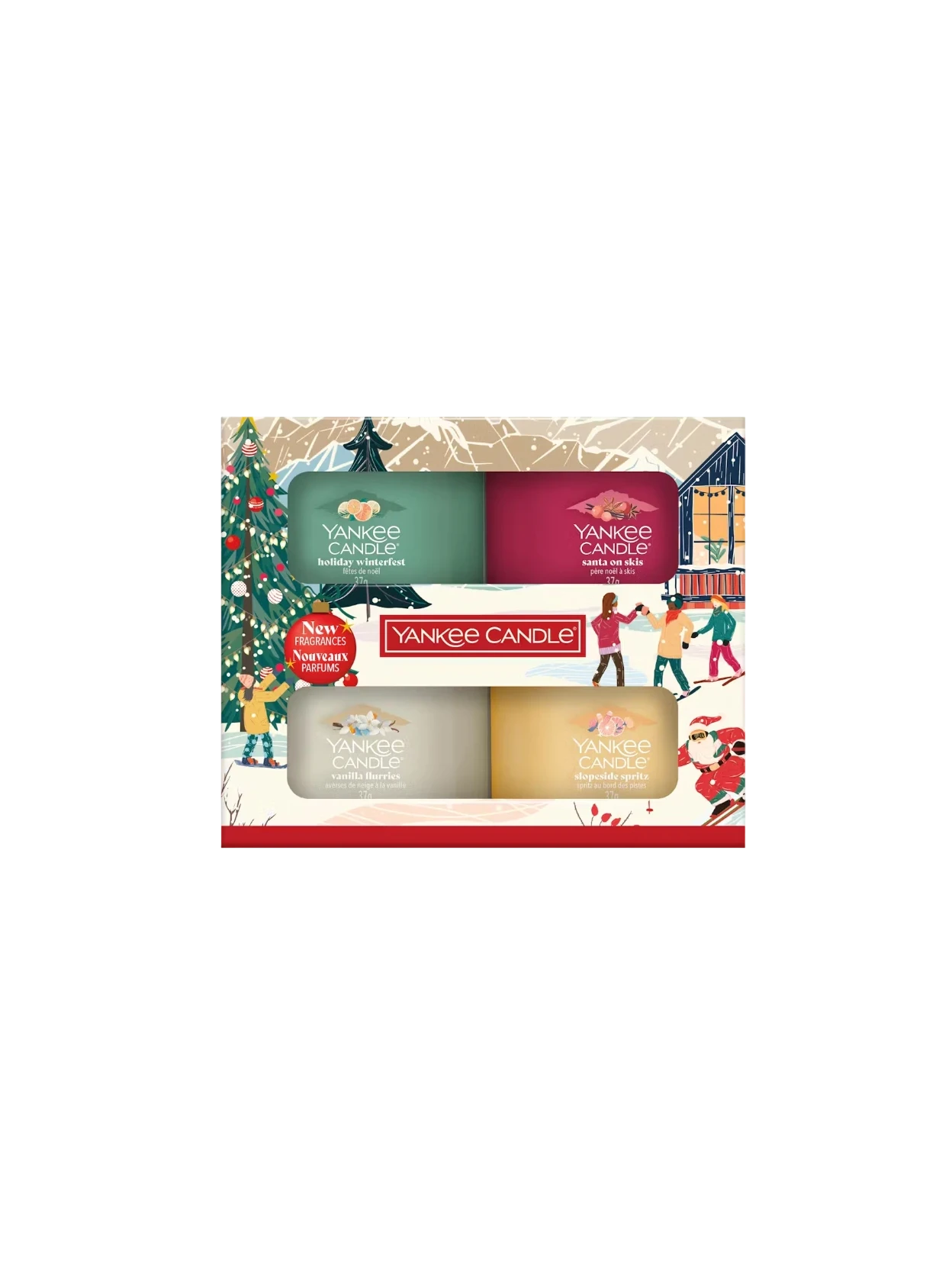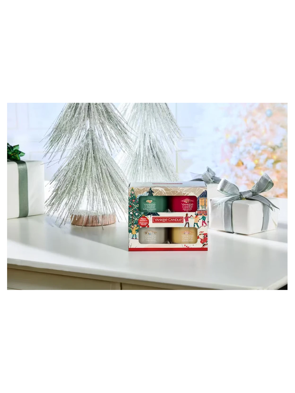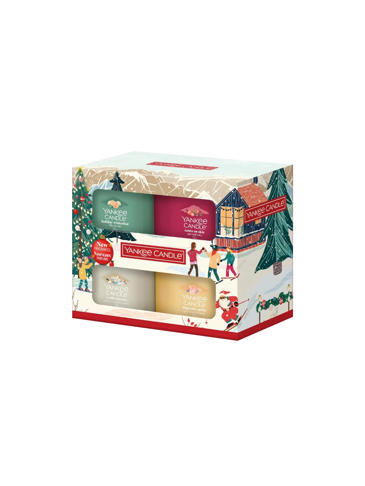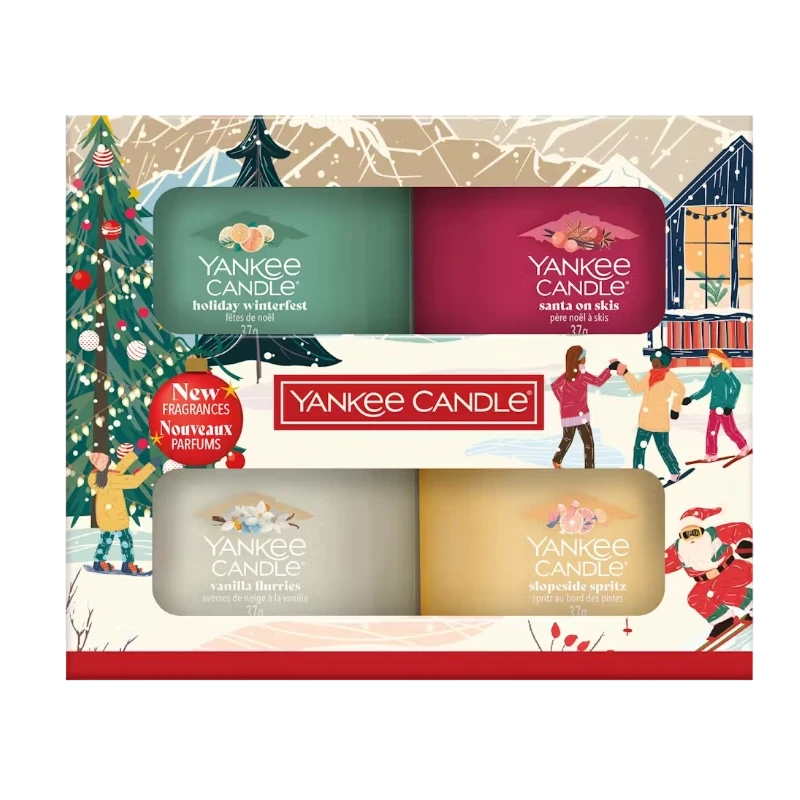 Discover Yankee Candle's new Après Ski holiday collection with this elegant gift set. It includes four mini scented candles: Holiday Winterfest, Santa on Skis, Slopeside Spritz, and Vanilla Flurries. A perfect way to experience the magic of Christmas.