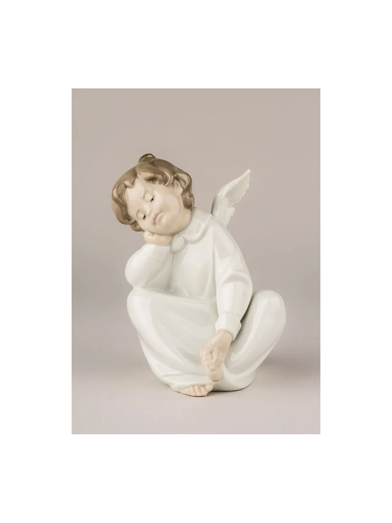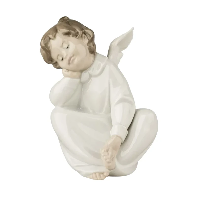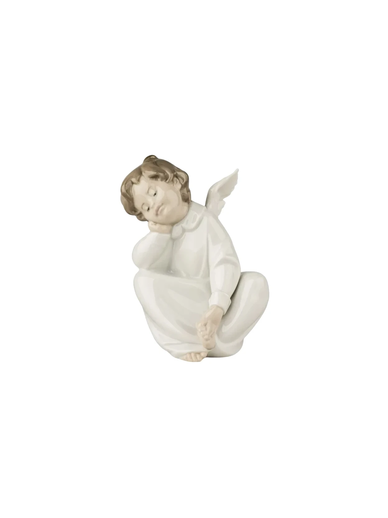 A delicate, glossy porcelain sculpture by Salvador Debón, depicting a seated angel with his head resting on his hand. Angels represent all that is pure, good, and eternal, and this figure elegantly adorns any space.