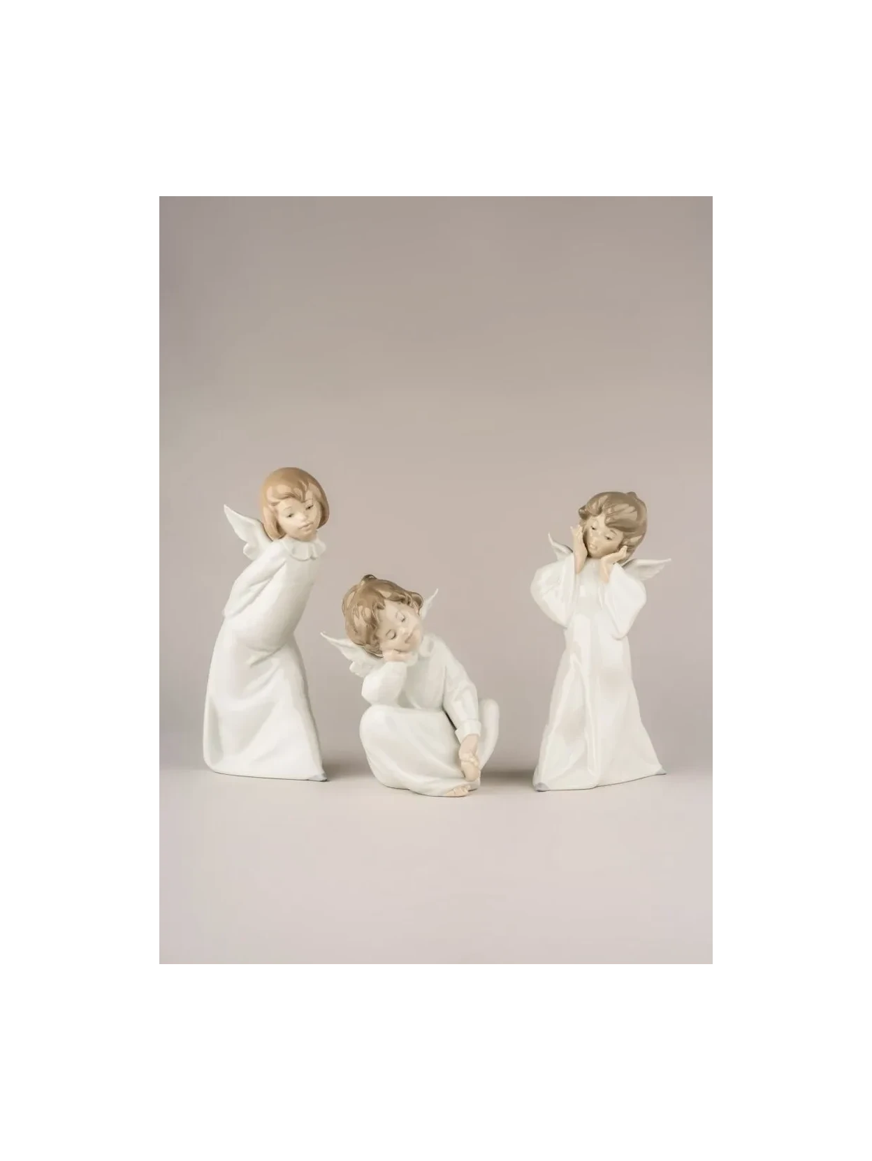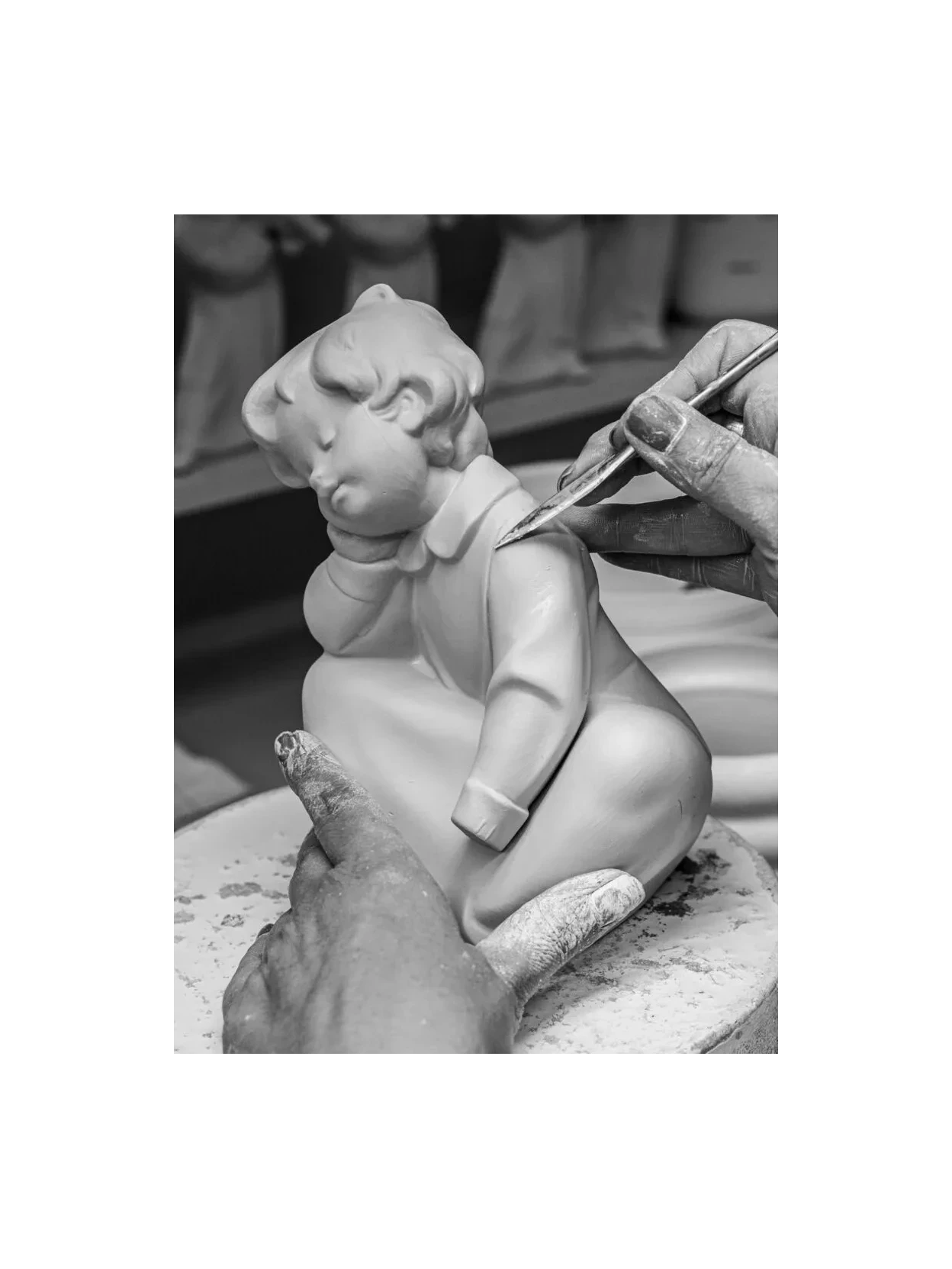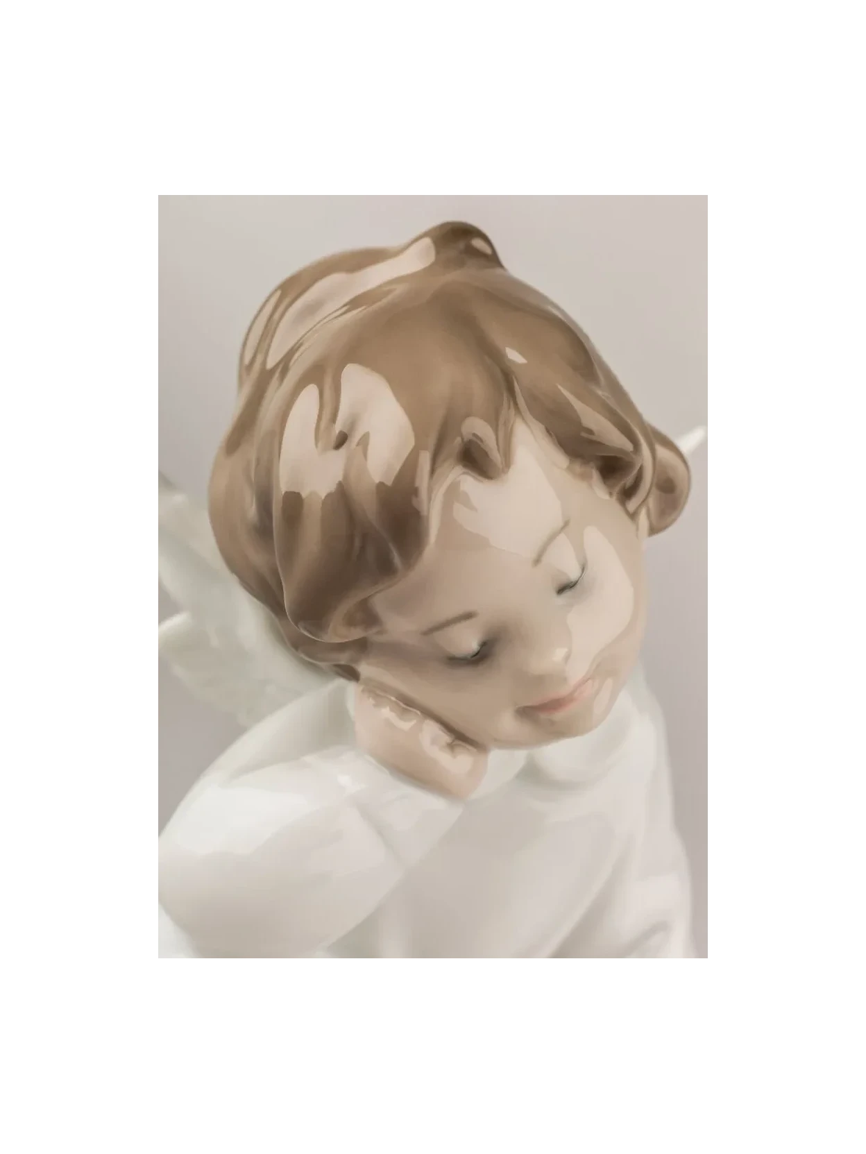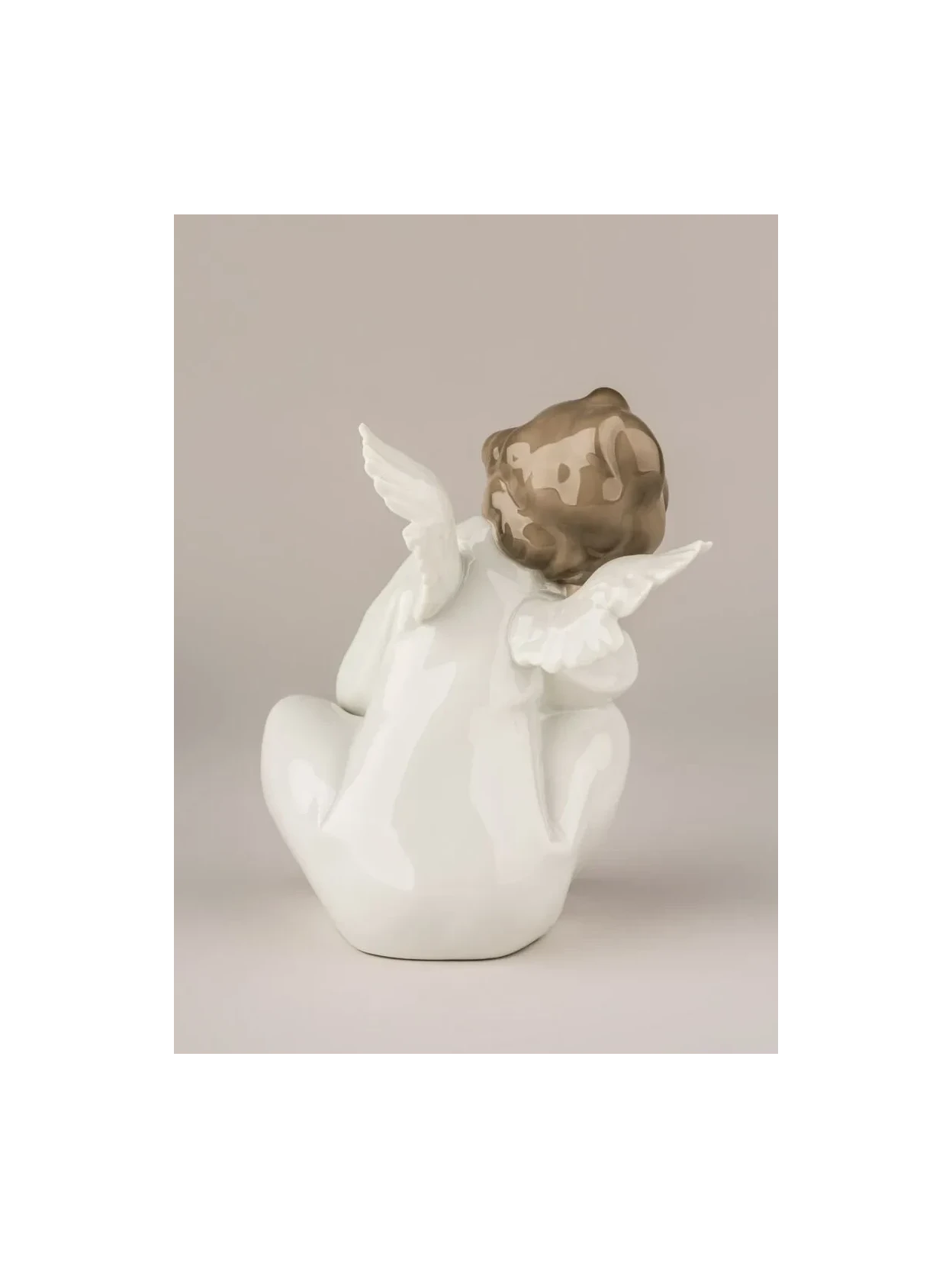 Lladró's "Little Angel" sculpture is a small masterpiece of sweetness and poetry, crafted from glossy porcelain and hand-molded by Salvador Debón. The angel sits with her head resting on her hand, conveying a sense of serenity, introspection, and innocence. Angels represent all that is pure, good, and eternal, and the delicate porcelain, decorated in classic Lladró pastel colors, ideally embodies these qualities, making the figure a symbol of beauty and protection to be treasured forever. Perfect for collecting, giving as a gift, or using as a refined decorative piece, this sculpture embodies the grace, lightness, and timeless elegance typical of Lladró creations.