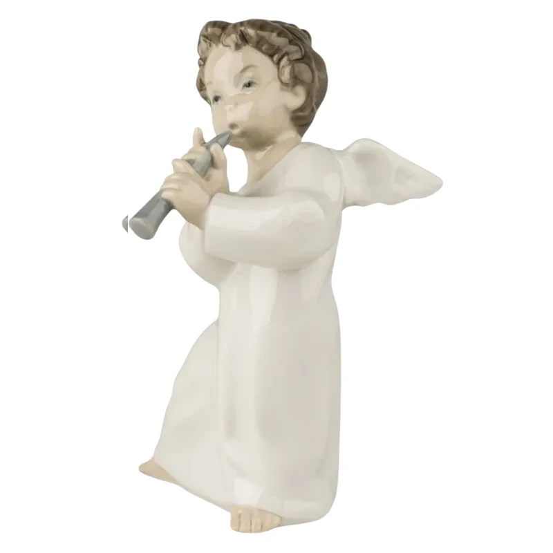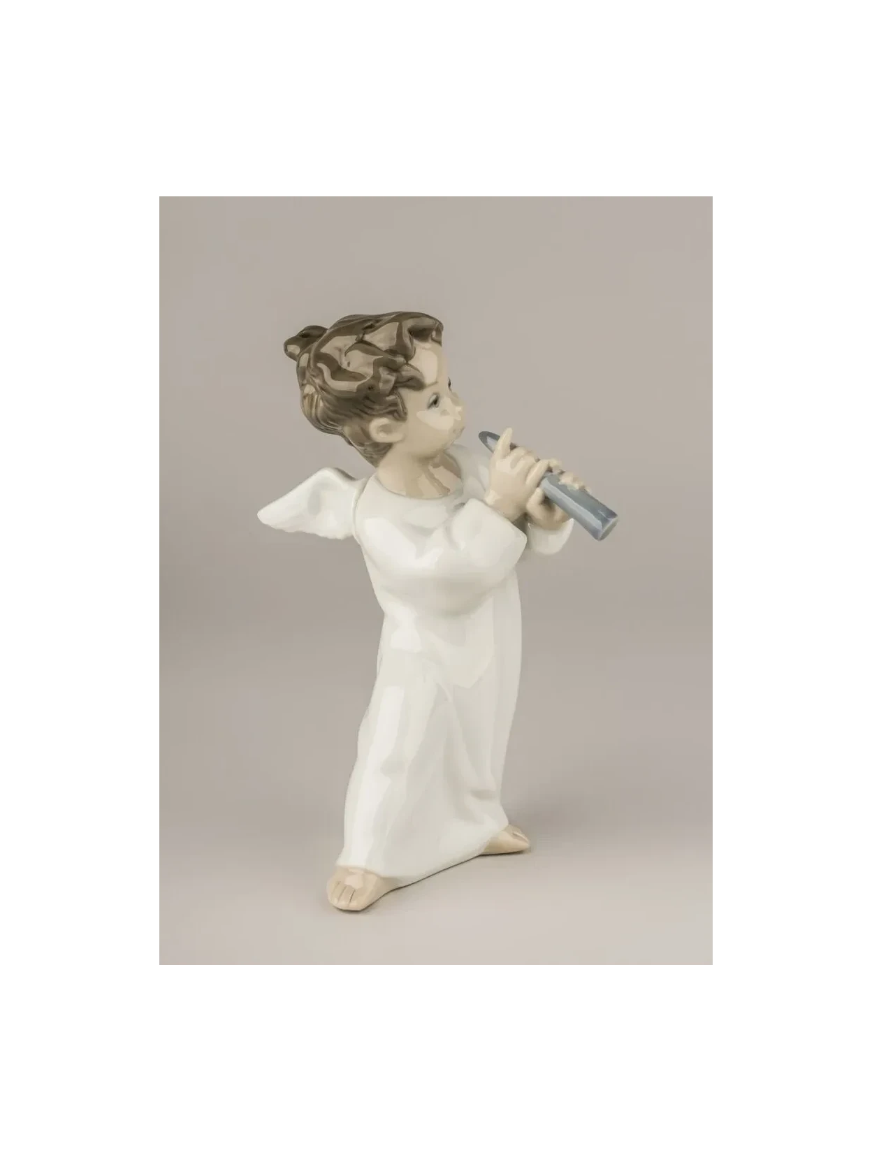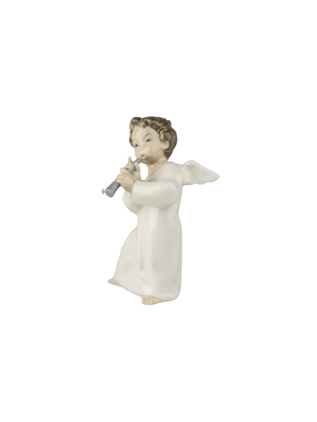 A delicate, glossy porcelain sculpture by Fulgencio García depicting a little angel playing the flute. A Lladró classic that exudes grace, serenity, and innocence.