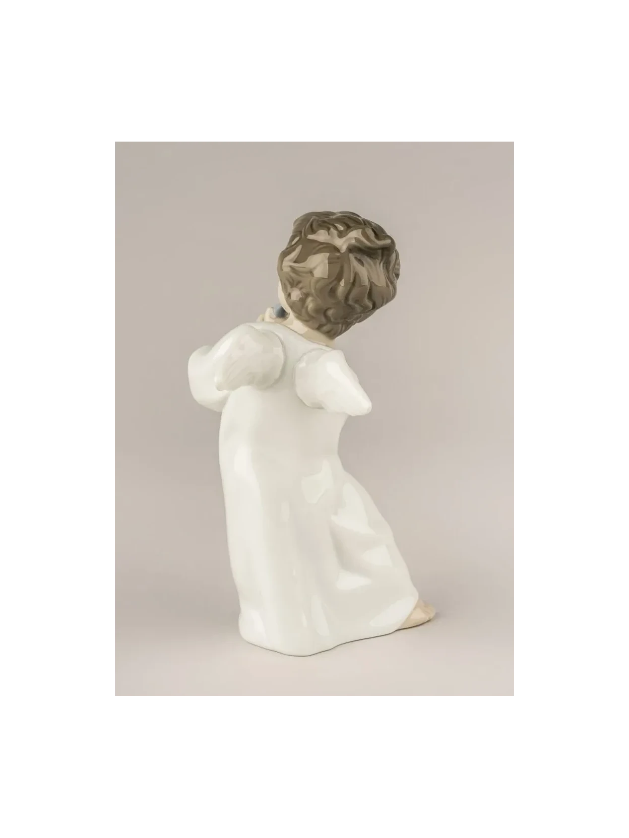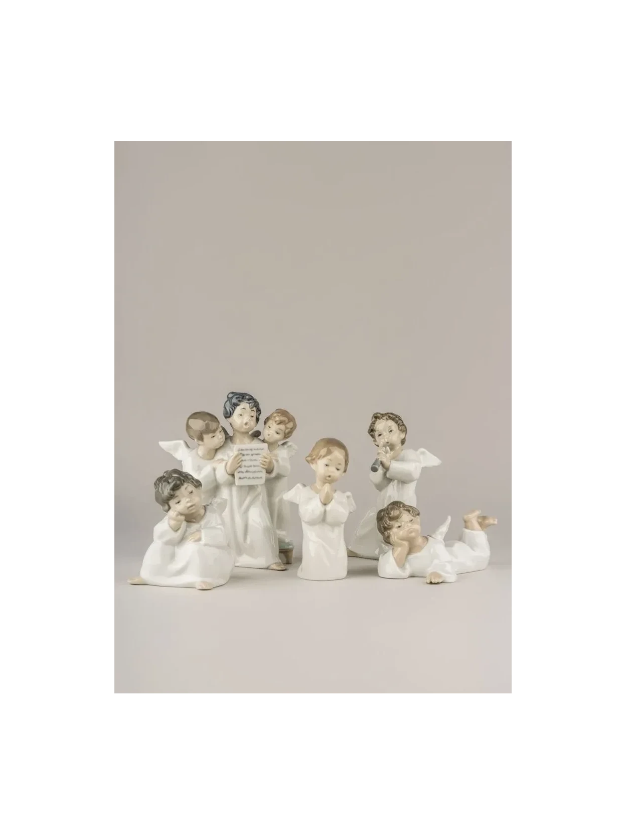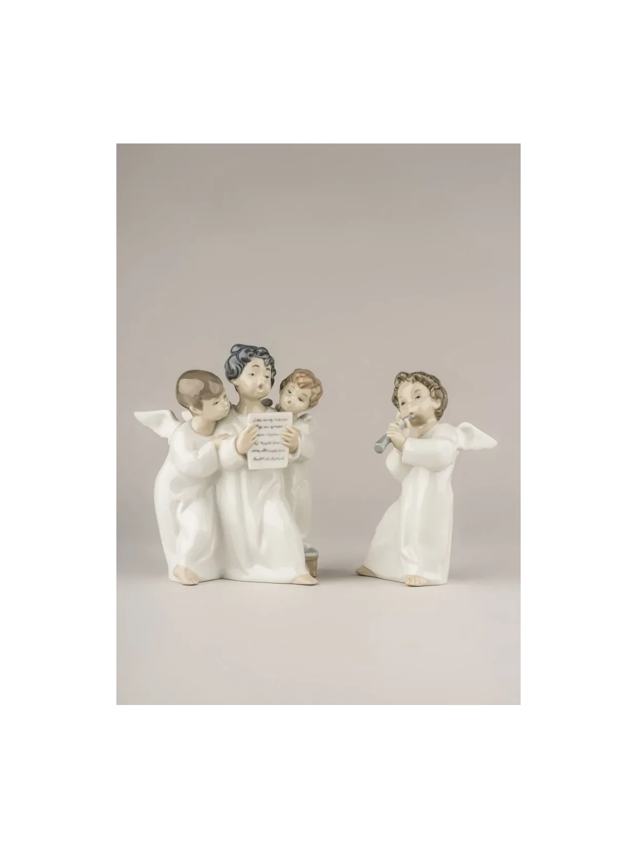 A delicate, glossy porcelain sculpture by Fulgencio García depicting a little angel playing the flute. A Lladró classic that exudes grace, serenity, and innocence.