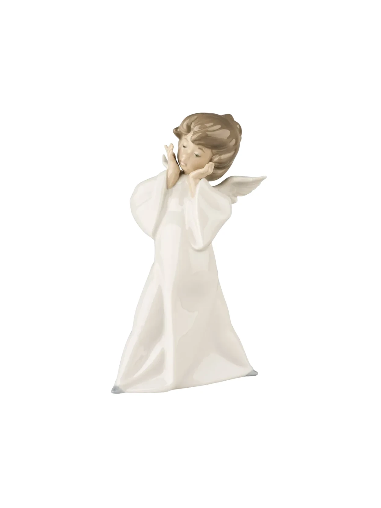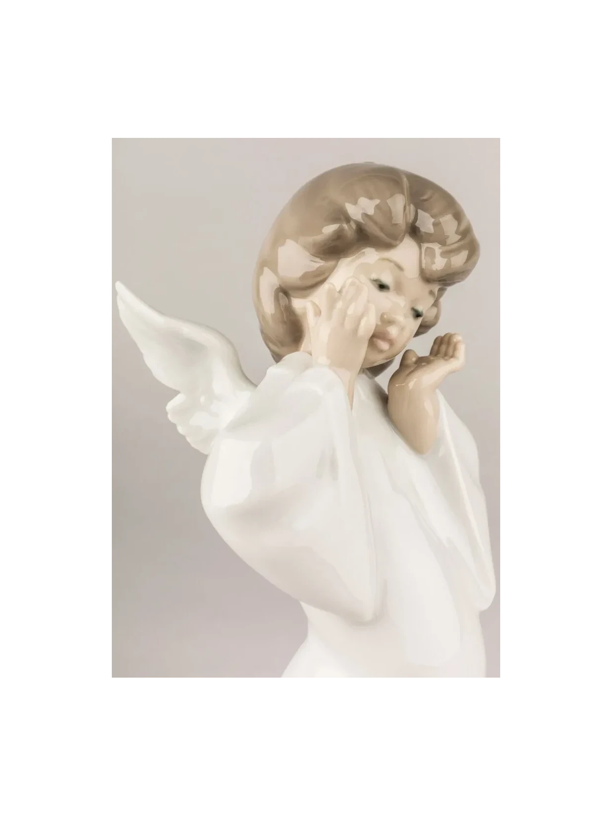 A delicate, glossy porcelain sculpture by Salvador Debón, depicting a surprised little angel with her hands in a delicate gesture. Perfect for collecting, gifting, or decorating.