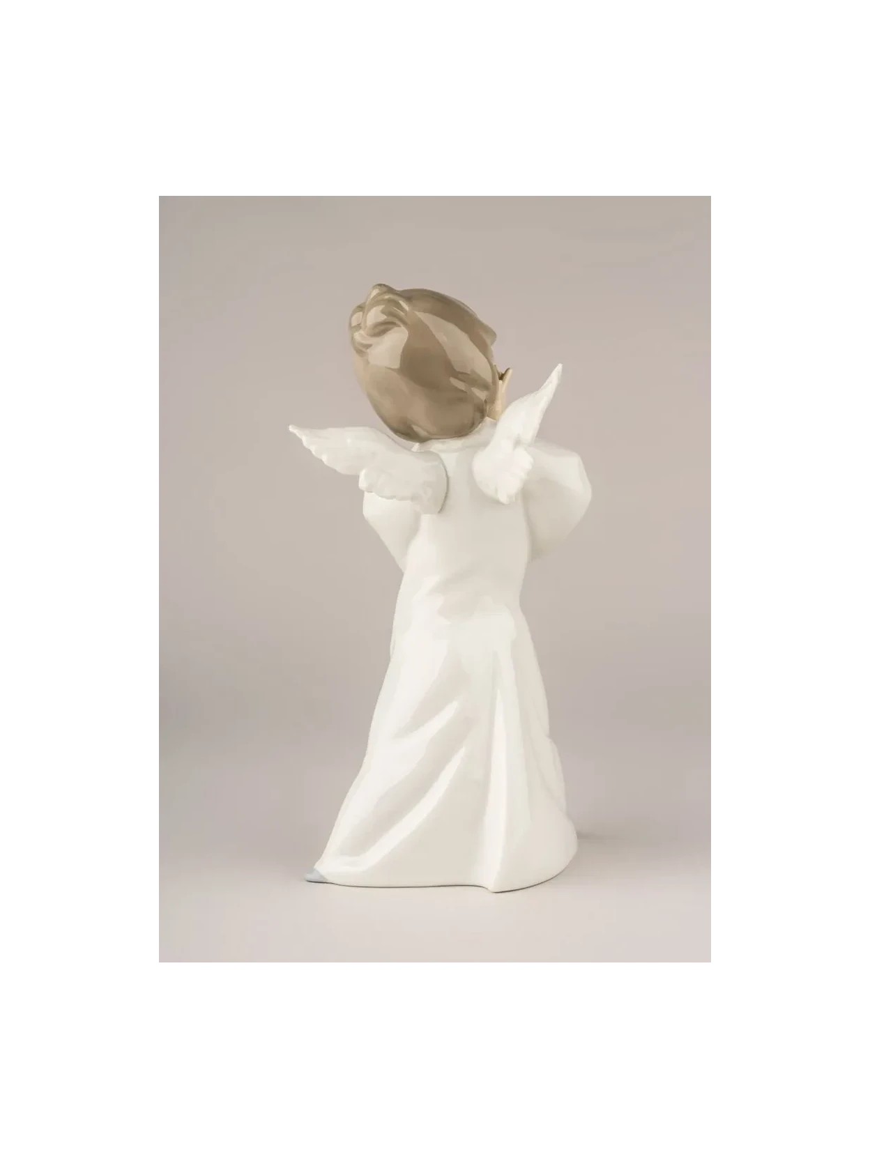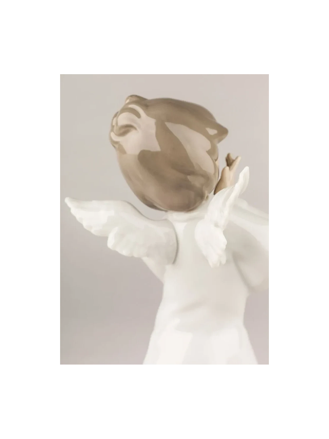 Lladró's "Little Angel" sculpture captures innocence and celestial wonder. Crafted from glossy porcelain and hand-molded by Salvador Debón, it depicts a small angel suspended among the clouds, amazed by what she observes, her hands in a natural and poetic gesture.