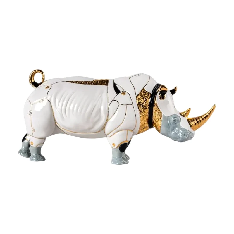 In an age dominated by scientific progress, Lladró reinterprets nature with a visionary and contemporary vision. The Cyborg Rhino Sculpture is born from the intersection of art, technology, and imagination: a being half animal, half machine, in which the rhino's natural power merges with the mechanical aesthetics of the future. The animal's powerful, sculpted forms come to life in glossy white porcelain, embellished with gold, black, and gray-blue details. The geometric lines and embossed surfaces evoke a metallic, robotic effect, highlighting the duality between organicity and artifice.