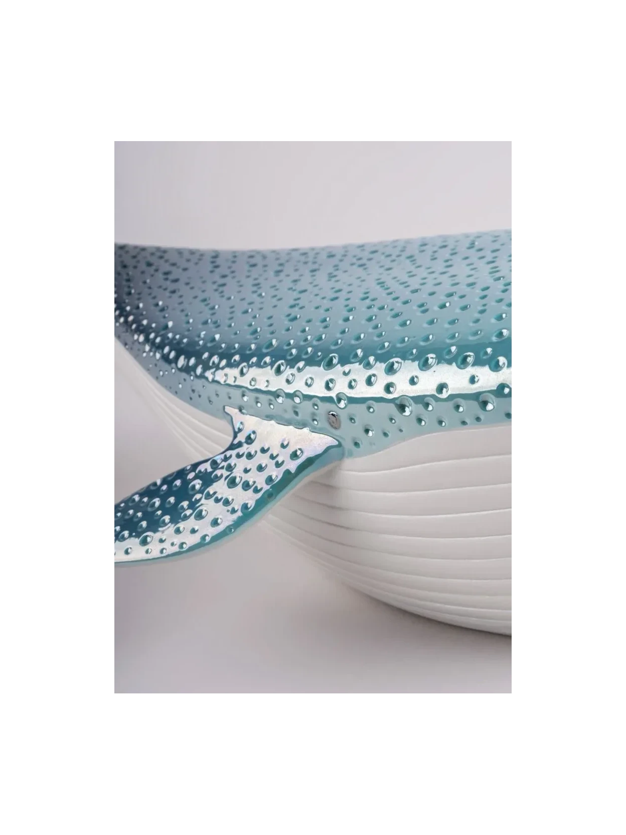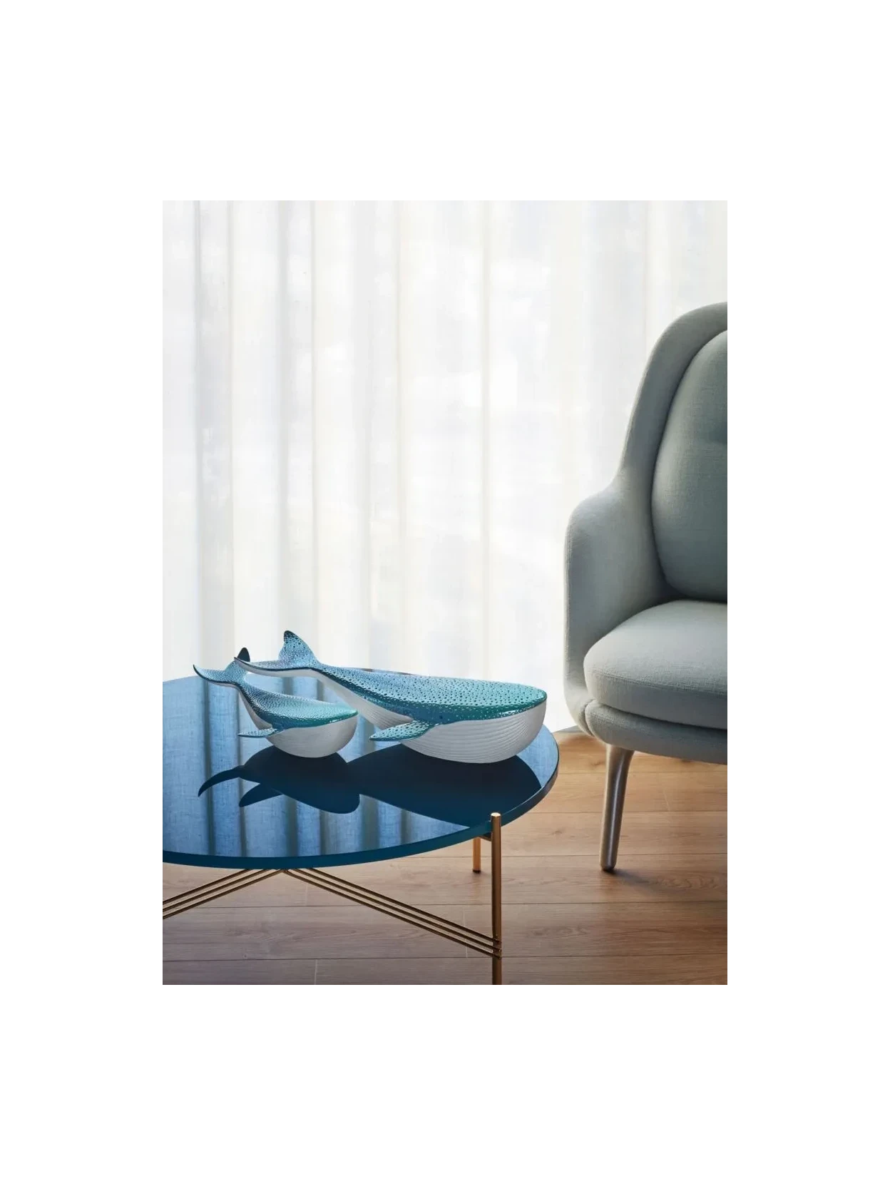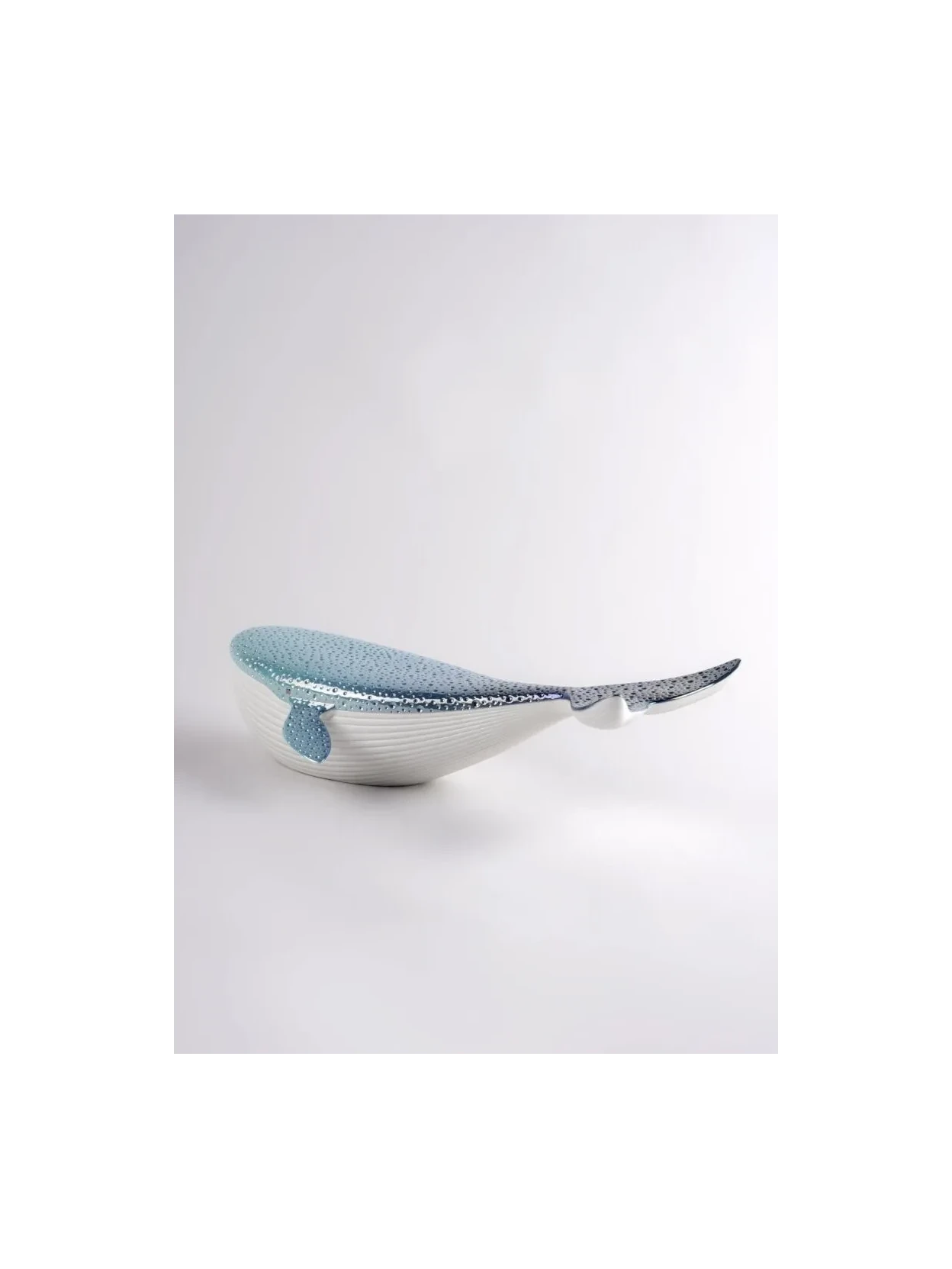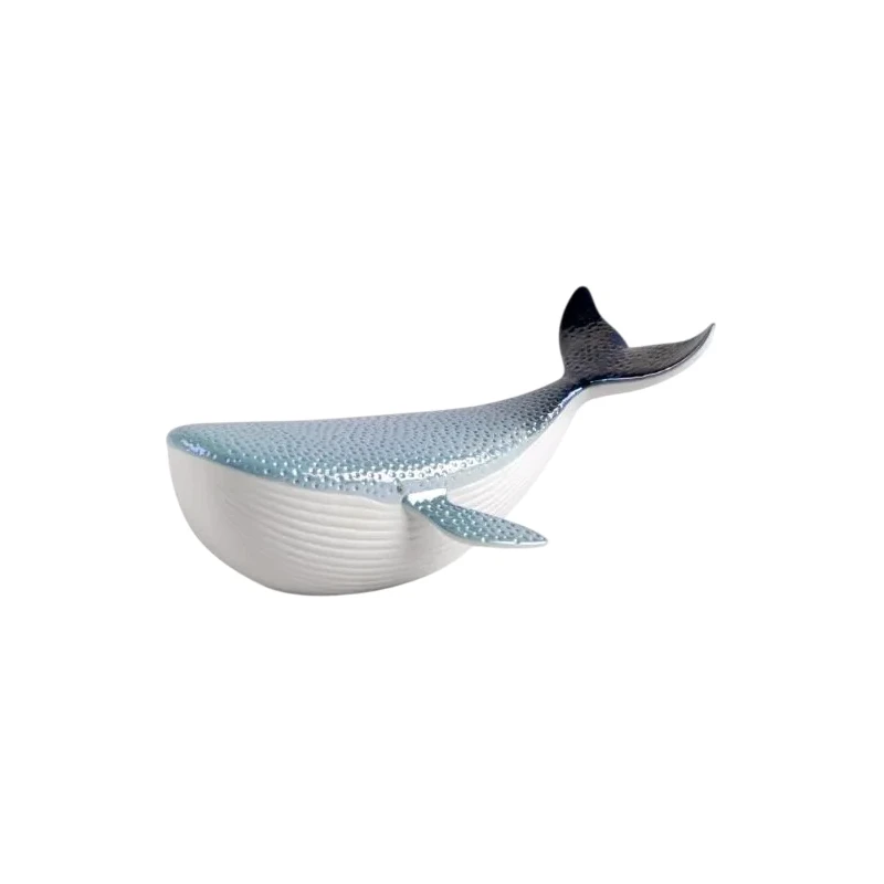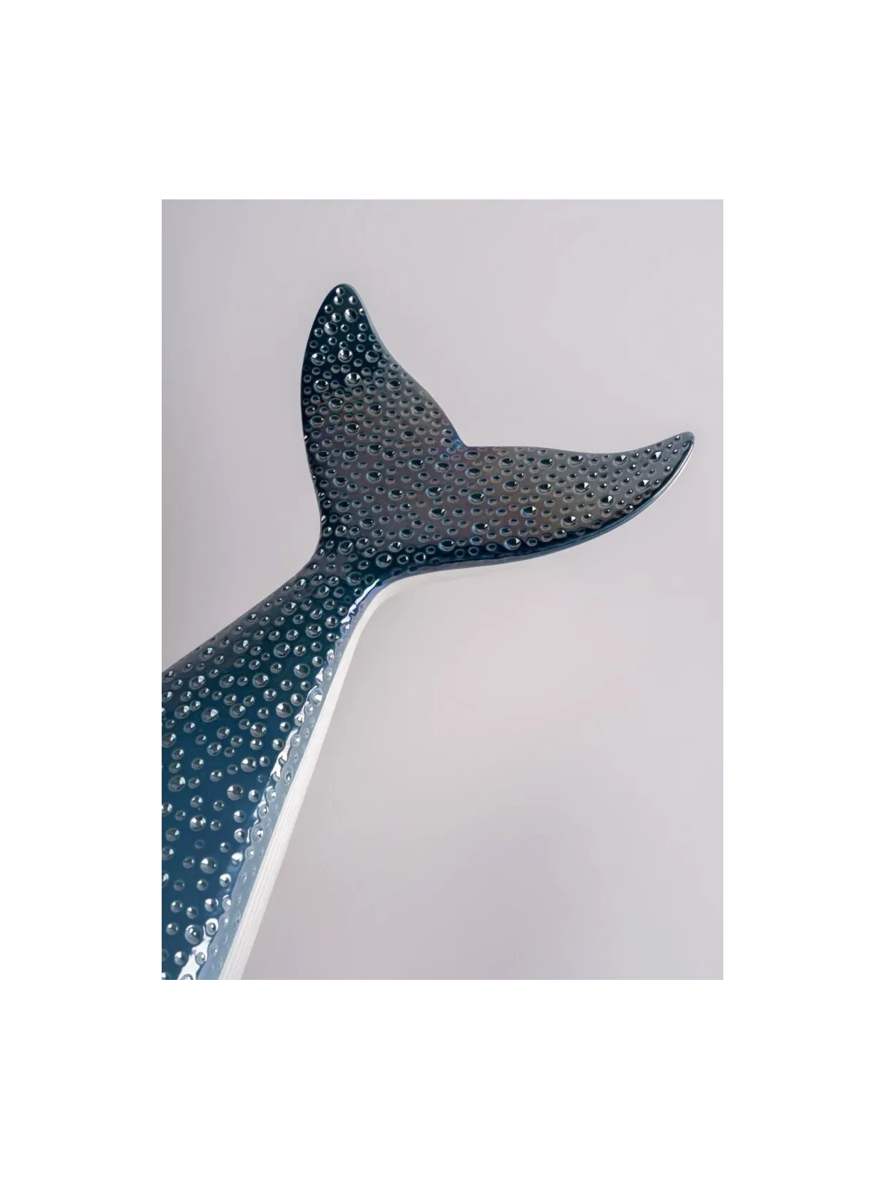 This blue and white porcelain sculpture, designed by Robert Schnyder, depicts one of the most imposing and fascinating marine creatures. A contemporary piece with a refined style, ideal for those who love the sea, nature, and artistic design. The lower section features an elegant matte white porcelain engraved with horizontal lines, while the upper section is decorated with an airbrushed blue gradient and finished with a delicate pearl effect. The result is a work that combines modernity and visual poetry, perfect as a gift or as a decorative element capable of enhancing any space. Handcrafted and backed by the Lladró guarantee, it is available in two sizes and expresses all the artisanal care and excellence of the brand.