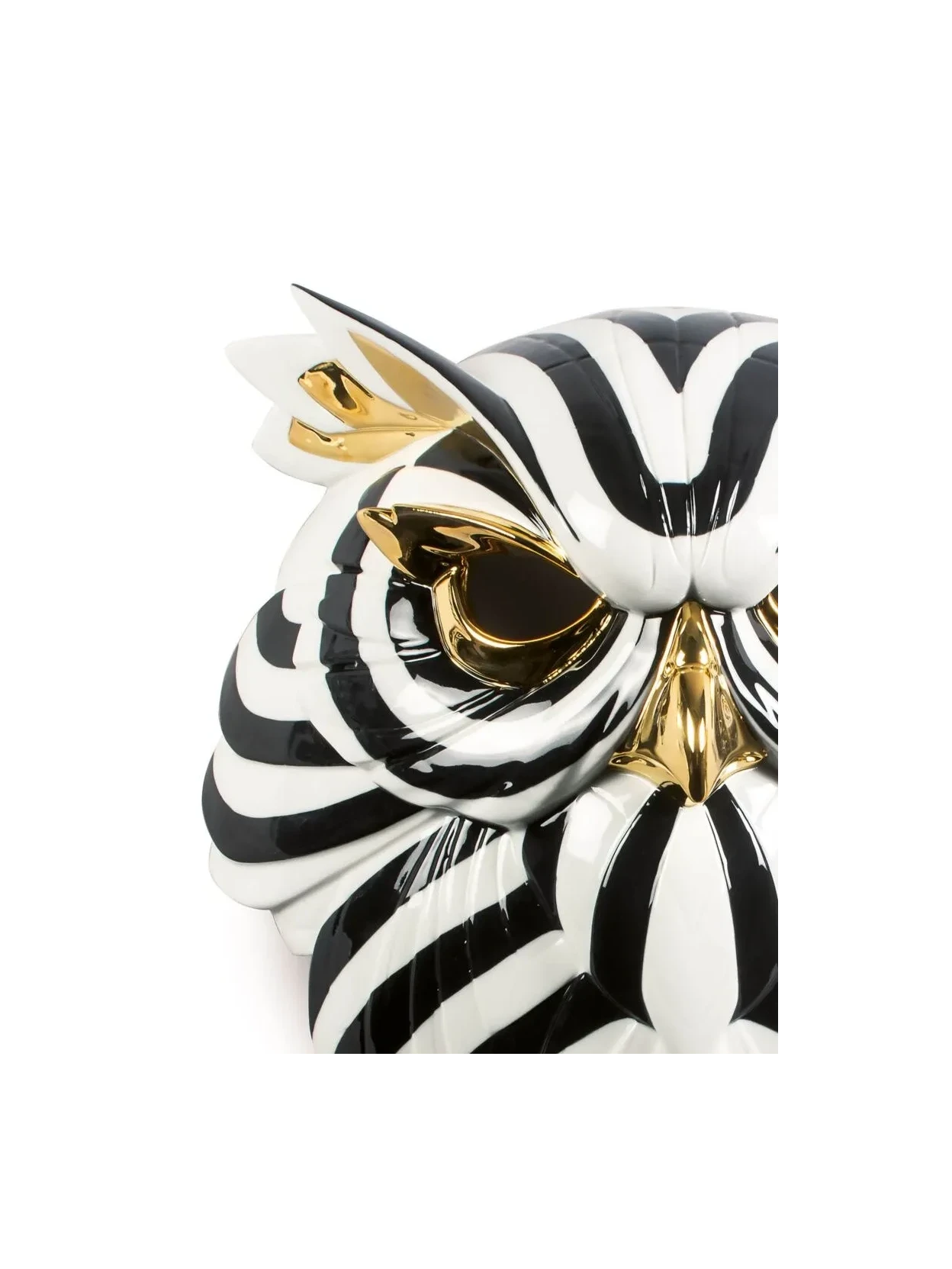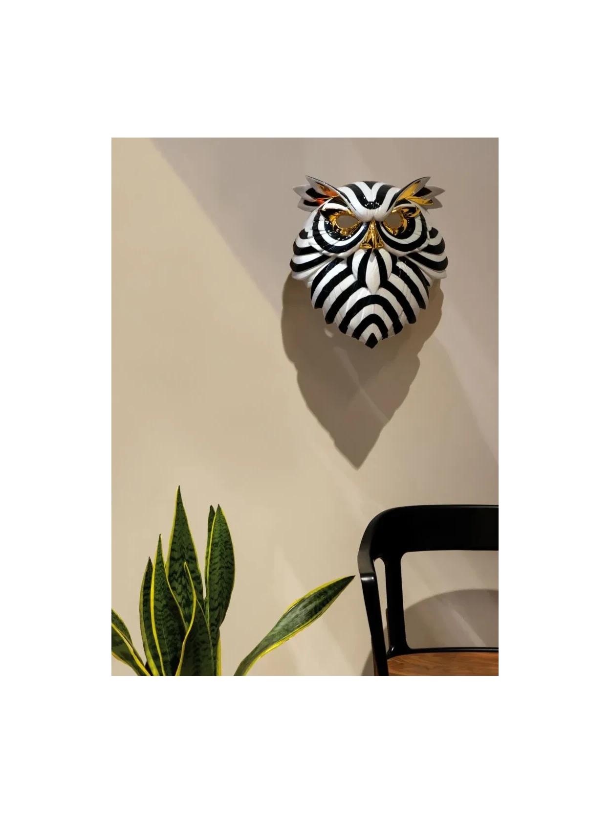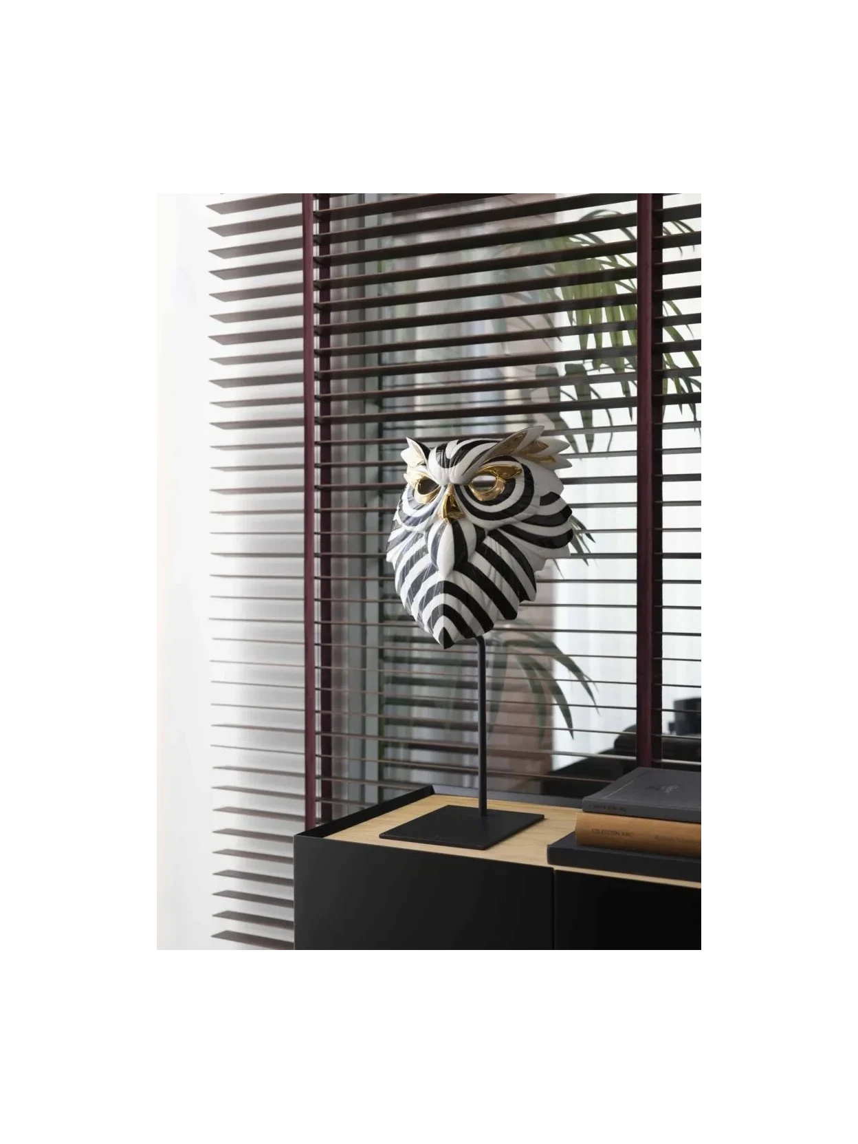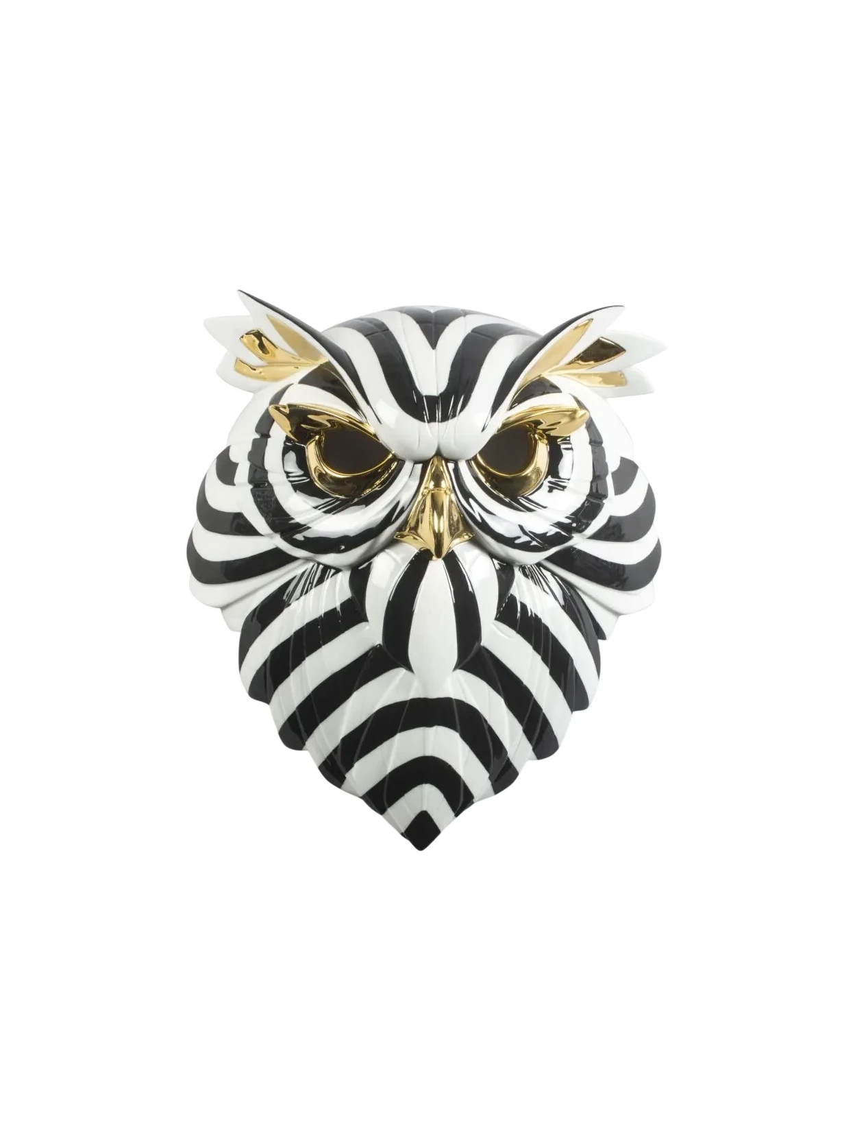 The Black Gold Owl Mask by Lladró is a lustrous porcelain sculpture with gold luster details and gold-plated sterling silver finishes. An elegant and modern piece, handmade in Spain, ideal for enhancing sophisticated spaces.