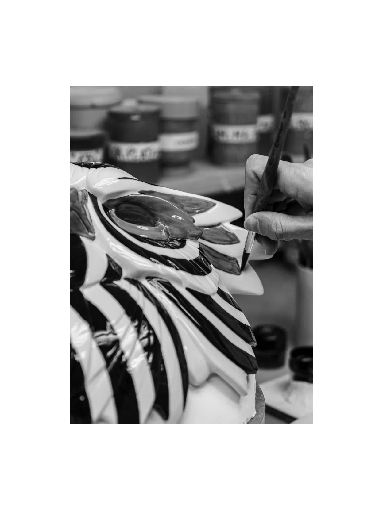 The Black and Gold Owl Mask Sculpture by Lladró is a captivating piece that tells a refined story of Spanish craftsmanship. Handcrafted and finished in glossy porcelain, it combines the mysterious allure of black with the luminosity of black and the preciousness of gold luster. The gold-plated sterling silver metal elements add a touch of contemporary elegance that makes this piece unique and sophisticated. With its modern lines and striking presence underscored by its large size, it is the perfect choice for those who wish to enrich their space with an iconic piece, born from the talent of sculptor José Luis Santes and a symbol of the 2019 Lladró collection.