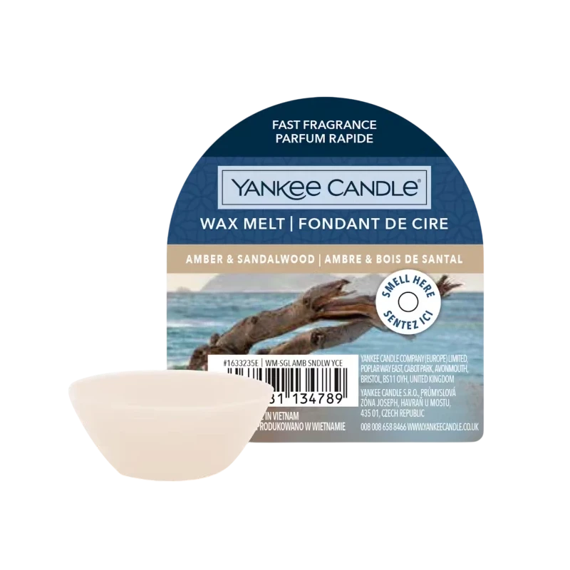 Yankee Candle Amber & Sandalwood is a wax melt with a sweet and spicy fragrance that evokes calm, nature, and freedom. Immerse yourself in the warmth of a secluded beach, where sun-kissed sand meets soothing notes of driftwood, cardamom, and amber. Amber & Sandalwood opens with vibrant accents of pepper and cardamom, followed by a soft heart of velvety amber and lavender. The warm and enveloping base notes combine sandalwood, cedarwood, and a delicate touch of vanilla, creating a serene and welcoming atmosphere.