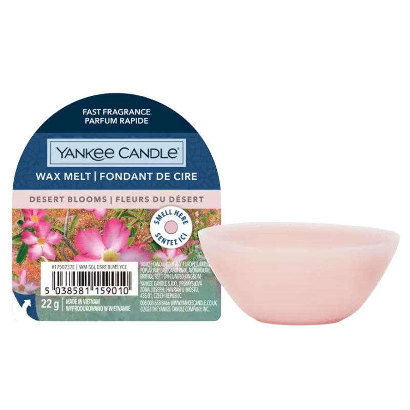 Yankee Candle's Desert Blooms is a wax tart that evokes the unexpected beauty of the desert in bloom: a refined and captivating fragrance that captures the essence of wild landscapes. Crisp notes of bergamot and saguaro cactus open the composition with a luminous freshness, like a breeze wafting across the warm sand at sunset. The floral heart combines the delicacy of rose petals with dried sage, for a perfect balance of sweetness and herbaceous notes. The base of time-honed woods and light musk adds depth and warmth, evoking the tranquility and natural elegance of a pristine landscape. An enveloping olfactory experience, inspired by the silent strength and hidden grace of the desert. Perfect for those who love natural, fresh scents rich in personality.