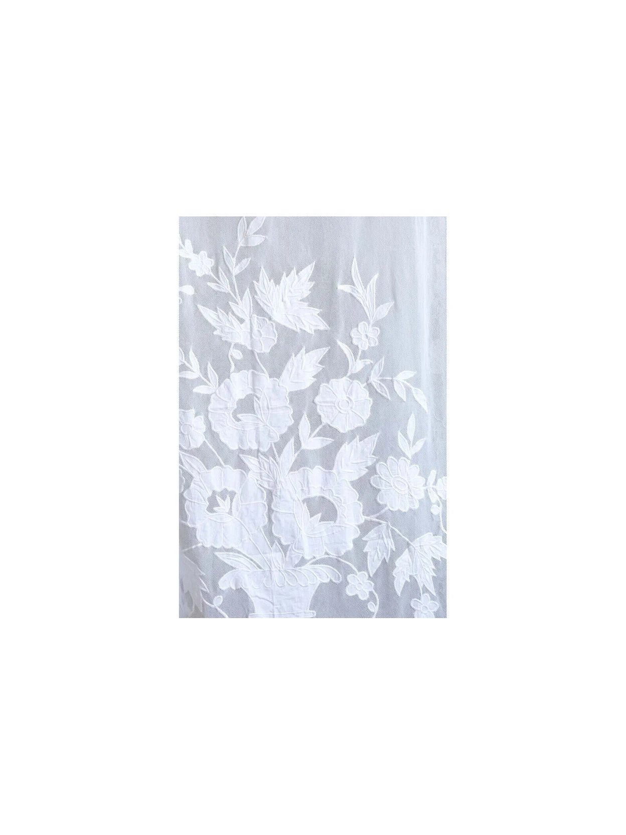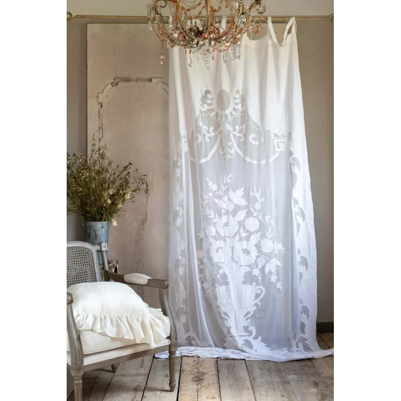 Elegant 100% cotton curtain, ideal for classic, shabby chic, and Provençal settings. With refined center and side embroidery, it brings light and charm to the living room or bedroom. Dimensions: 140x290 cm. Easy to attach with ties.