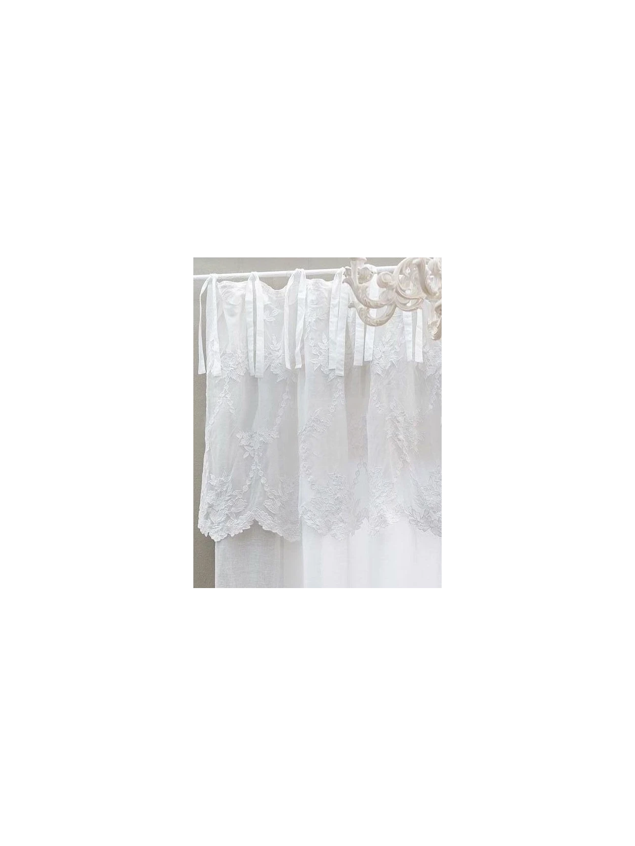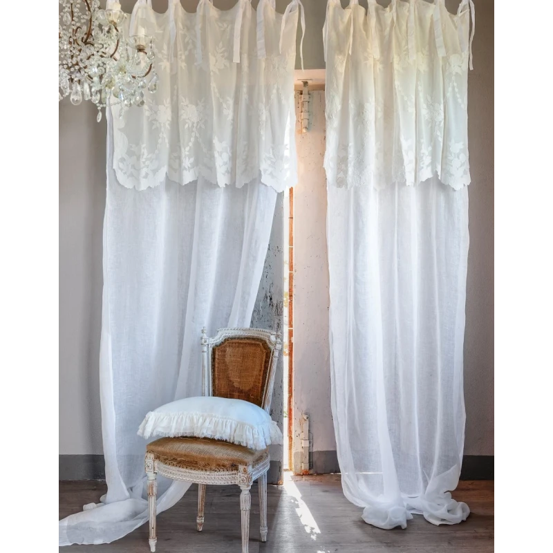 Bring a touch of sophistication and romance to your home with the Clarissa Collection curtain with valance by Blanc Mariclò. Crafted from a fine linen blend (55% linen, 45% cotton) in cream, this curtain transforms any room into a welcoming and sophisticated haven. The embroidered valance at the top adds an elegant and distinctive detail, while the practical ties allow for simple and secure attachment to the curtain rod. Measuring 140 x 290 cm, it's perfect for windows of various sizes and suitable for both living rooms and bedrooms, creating a bright, warm, and romantic atmosphere. The Clarissa Collection isn't just a curtain: it's a decorative element capable of enhancing any room, bringing style, charm, and timeless elegance to your home.