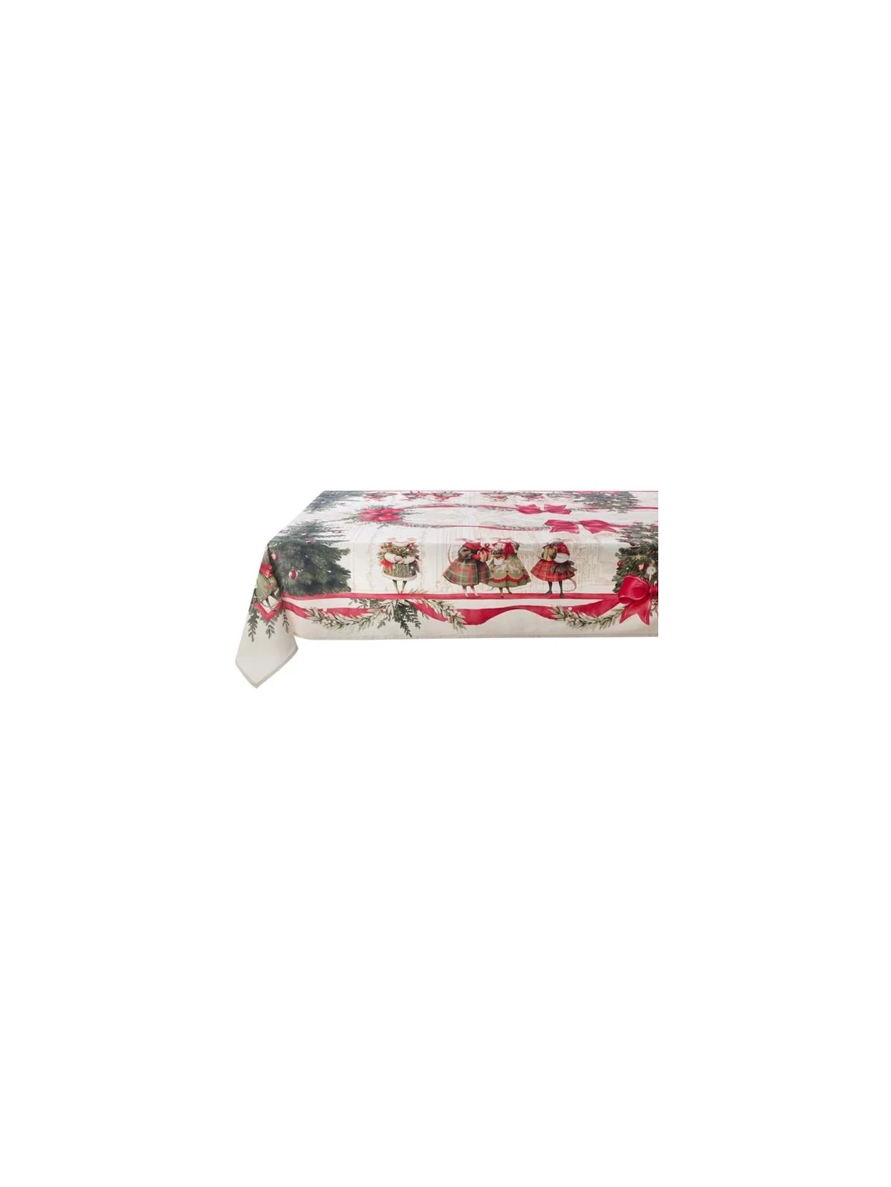 Bring the magic of Christmas to your table with our tablecloth from the Christmas Tale collection. Made of 100% cotton, it's soft, durable, and easy to wash, perfect for family gatherings. The design tells an enchanting story: little mice dressed in Christmas clothes exchange gifts and greetings among snowflakes and Christmas trees, creating a warm and joyful atmosphere. Its generous dimensions (160 x 350 cm) make it ideal for long tables or festive buffets.