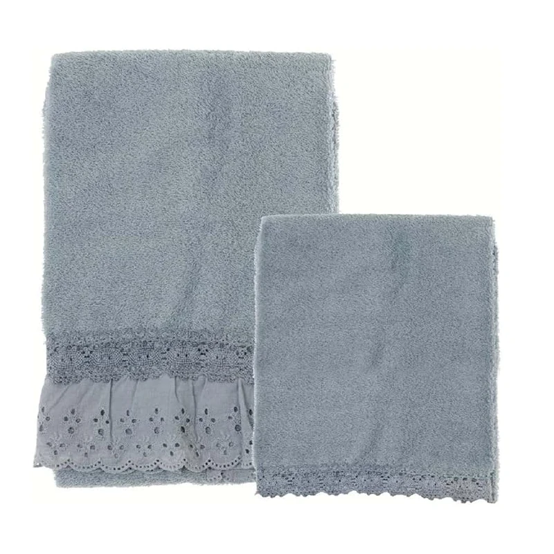 Update your bathroom with the Blanc Mariclò 100% cotton Sangallo lace towel set. Soft, fluffy, and highly absorbent, these towels offer maximum comfort for everyday use. Embellished with elegant matching Sangallo lace, they add a touch of sophistication and style to your bathroom, making your daily routine more enjoyable. The set includes two sizes, 30x50 cm and 50x80 cm, perfect for both face and body, and the light blue color lends a fresh, harmonious feel to the room.