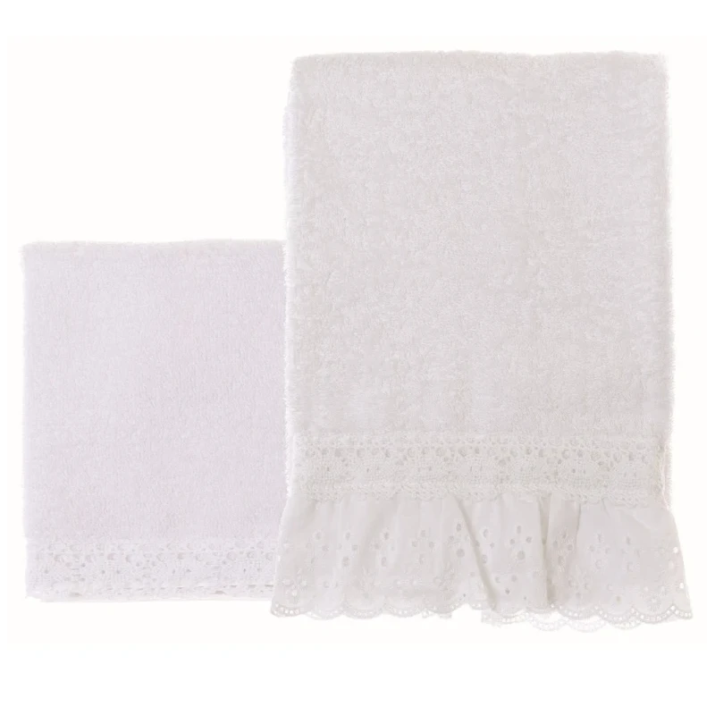 An elegant pair of 100% cotton towels with a ruffle. Soft and comfortable, they are embellished with refined matching Sangallo lace.