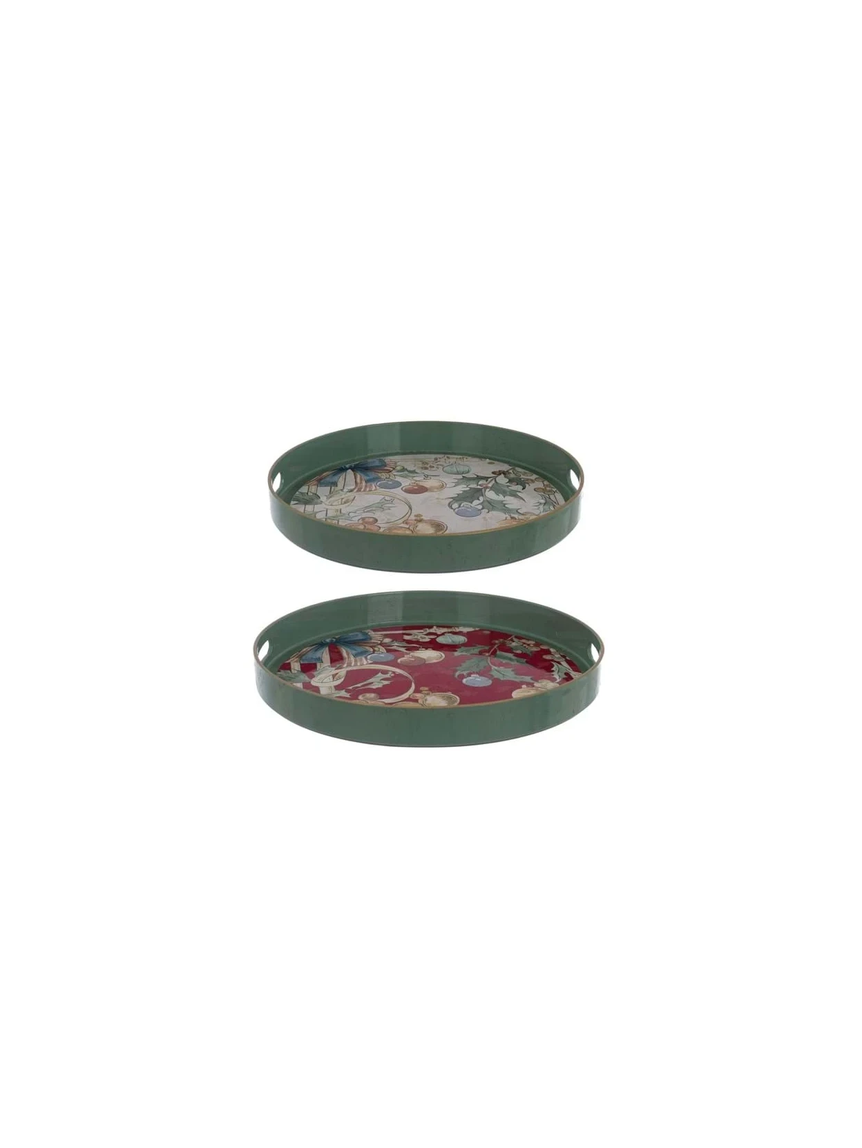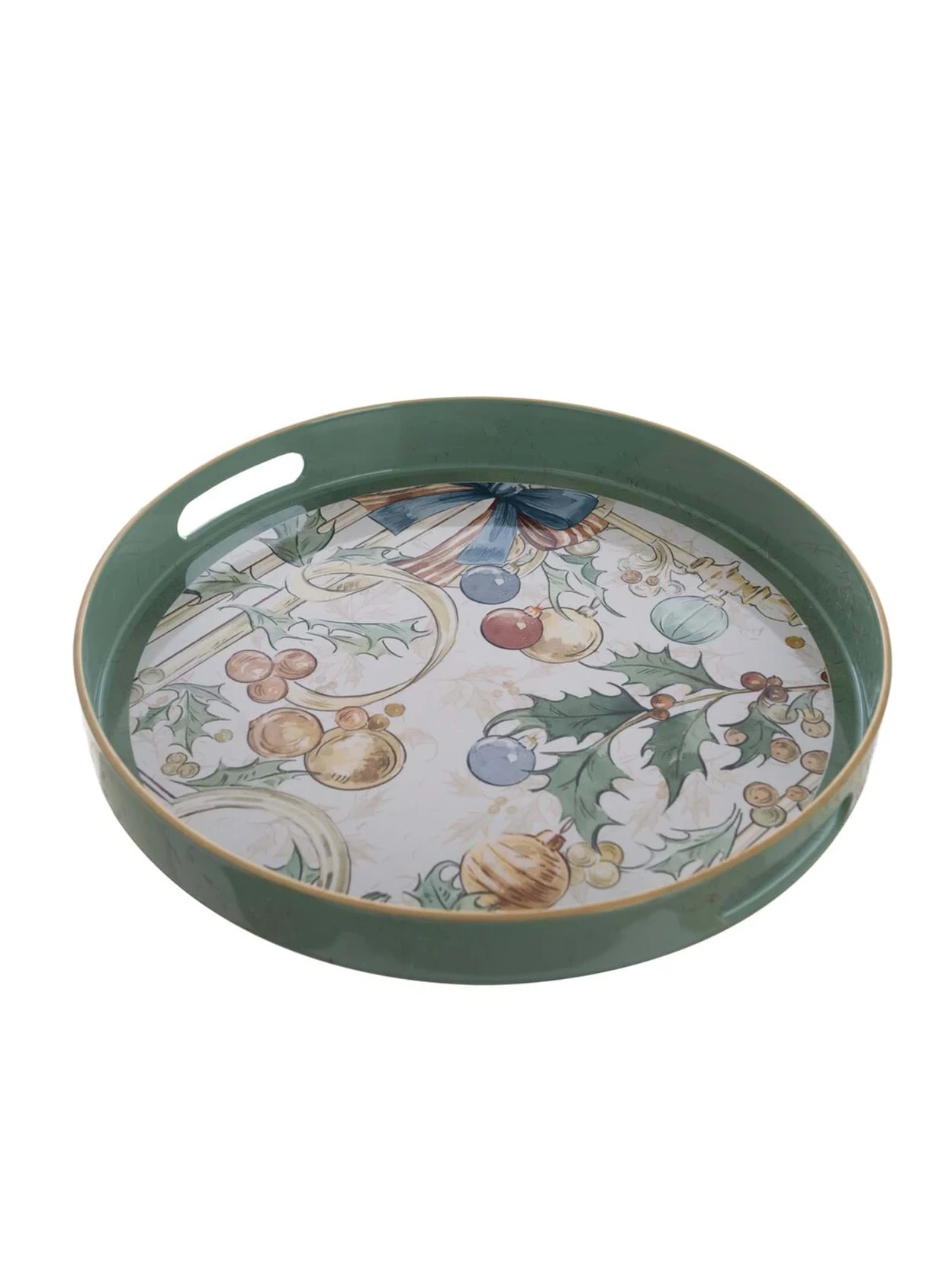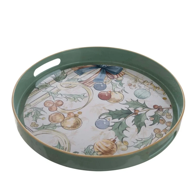 The Intrecci di Sogno round tray by Blanc MariClò is a refined and festive furnishing accessory, perfect for enhancing your Christmas table. Crafted from green plastic with a gold edge and an elegant ivory base, it's decorated with Christmas motifs like holly, baubles, and bows, evoking the magic of the holidays. With a diameter of 33 cm and a height of 4 cm, it's ideal for serving desserts, cookies, or drinks, but also as a decorative base for centerpieces and light arrangements. Blanc MariClò's romantic style and attention to detail make it an elegant accessory, perfect for those who love to bring a touch of warmth and sophistication to their home during the Christmas season.