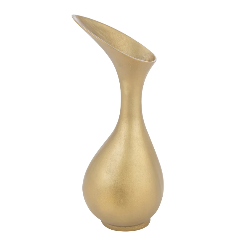 This vase is a striking decorative element, ideal for those seeking a contemporary and sophisticated style. Crafted from high-quality aluminum with a bright gold finish, this vase stands out for its sinuous shape and slanted neck, which lend movement and dynamism to the composition. Standing 60 cm tall and with a compact base, it is perfect for medium-sized plants or elegant floral arrangements, instantly becoming the centerpiece of living rooms, entryways, or living areas. Its lightness and durability make it versatile and easy to position, while its refined design adds a touch of discreet luxury to any space. Perfect for modern, contemporary, or minimalist spaces, this gold aluminum vase combines aesthetics and functionality, transforming every corner of the home into an elegant and welcoming environment.