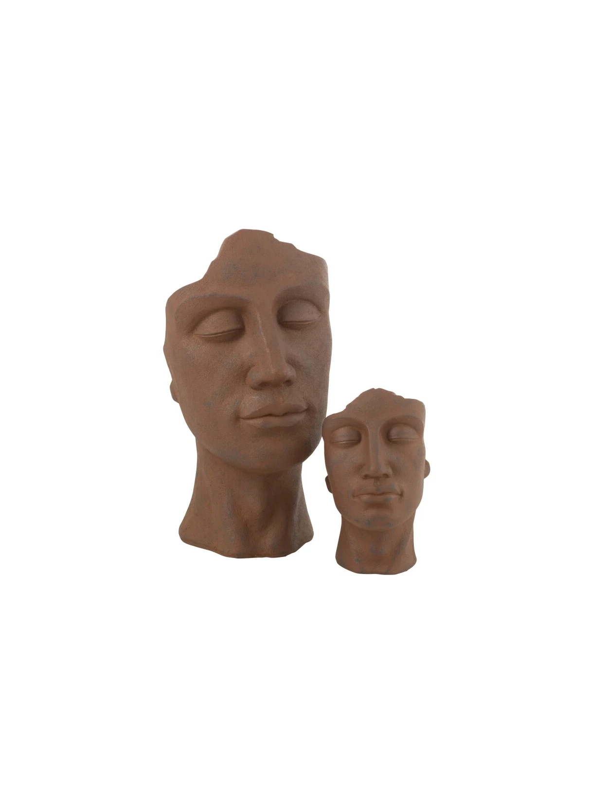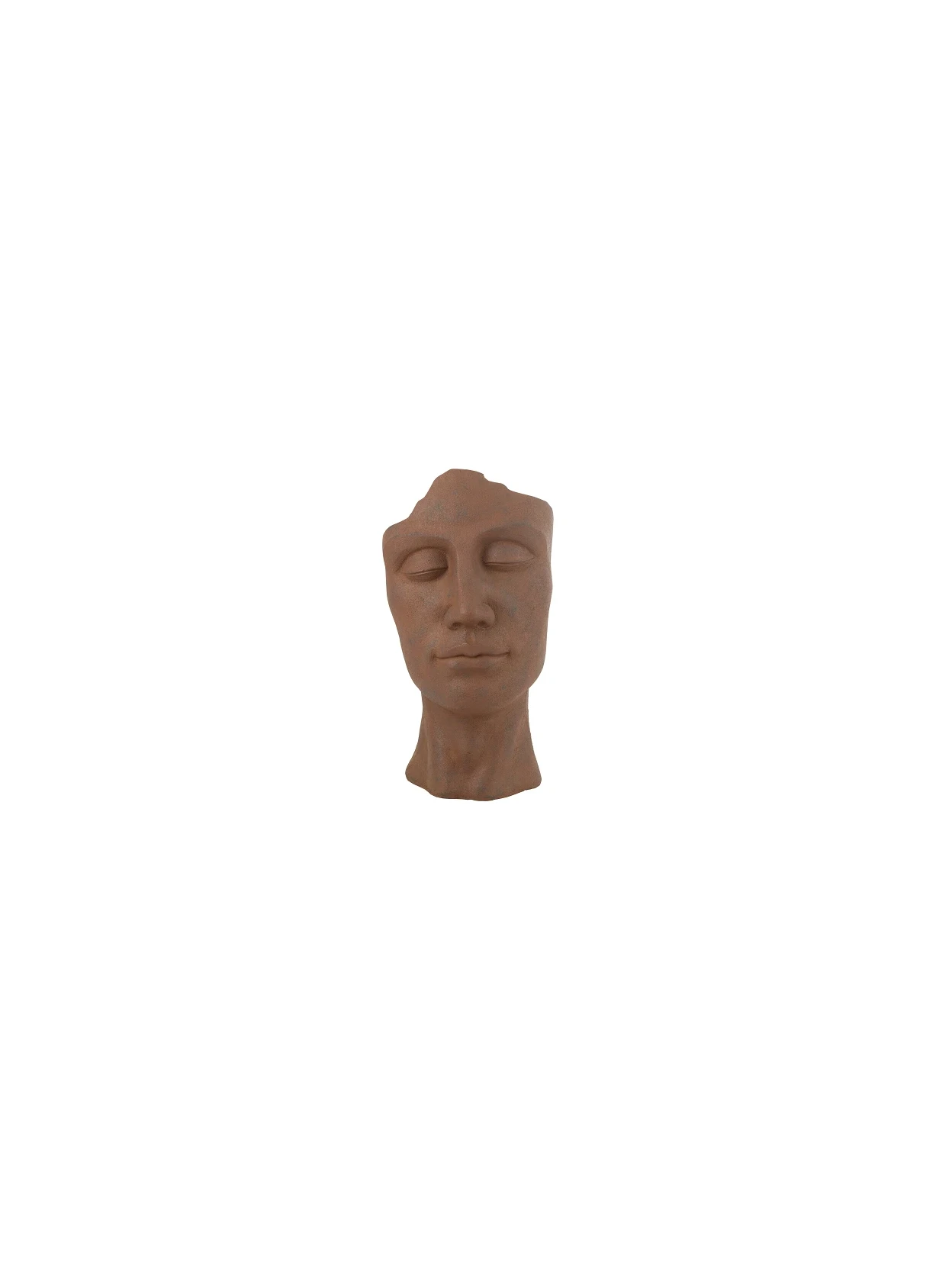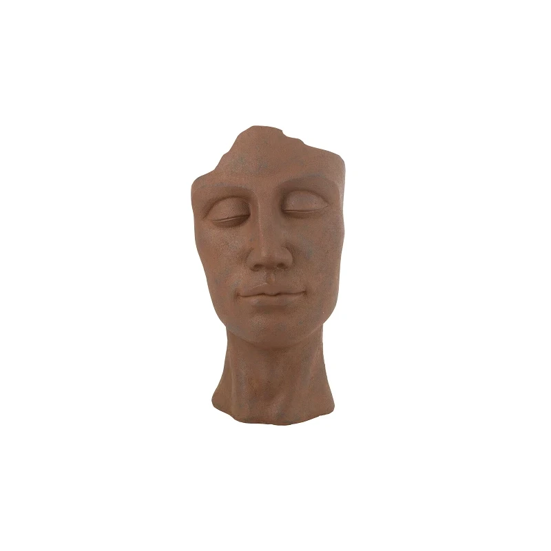 Rust-colored ceramic planter in the shape of a man's face, with an artistic and original design. Durable and suitable for outdoor use.