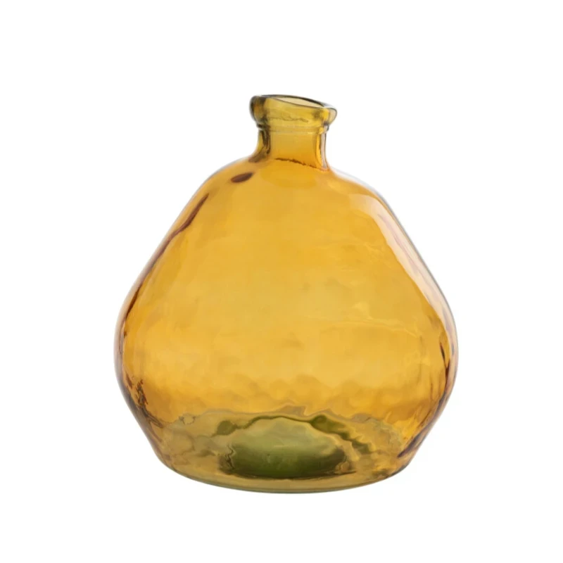 The Laura vase, made of ochre glass, is an elegant accessory, perfect for decorating living rooms, entrances, or modern spaces with style and color.