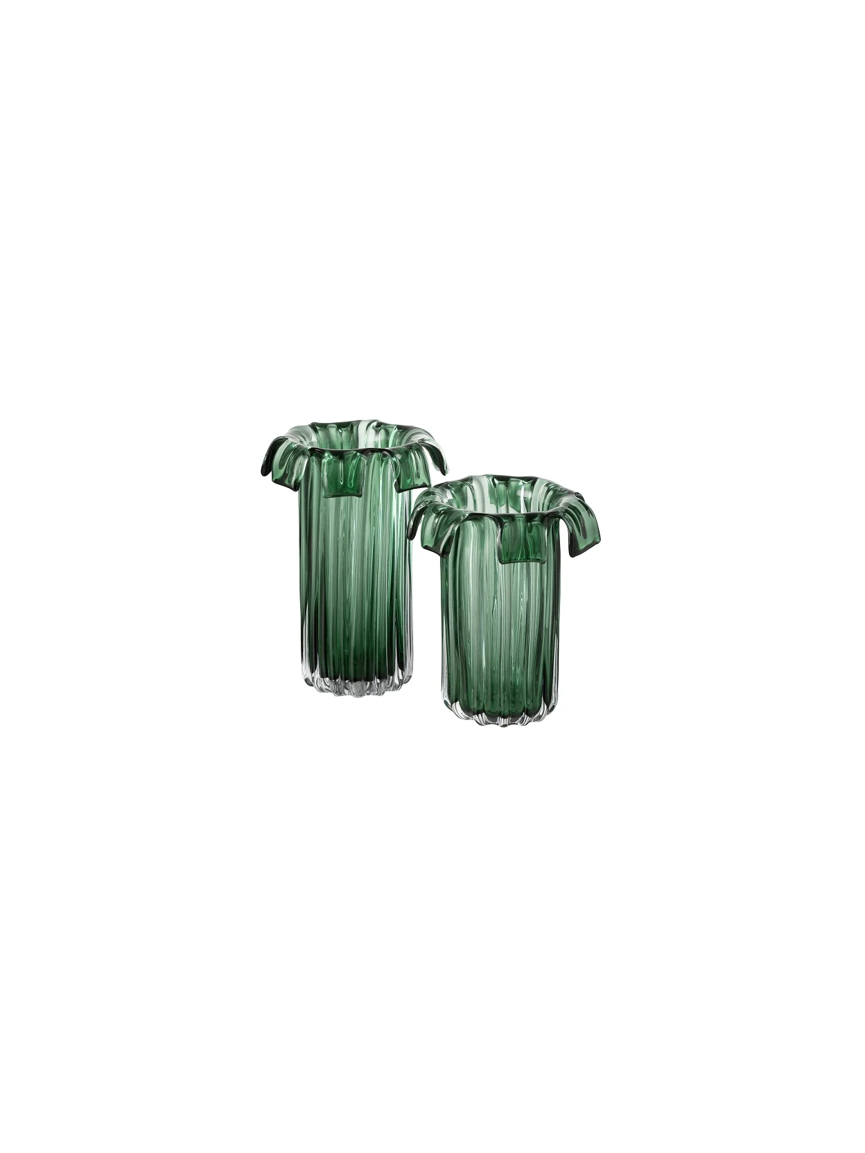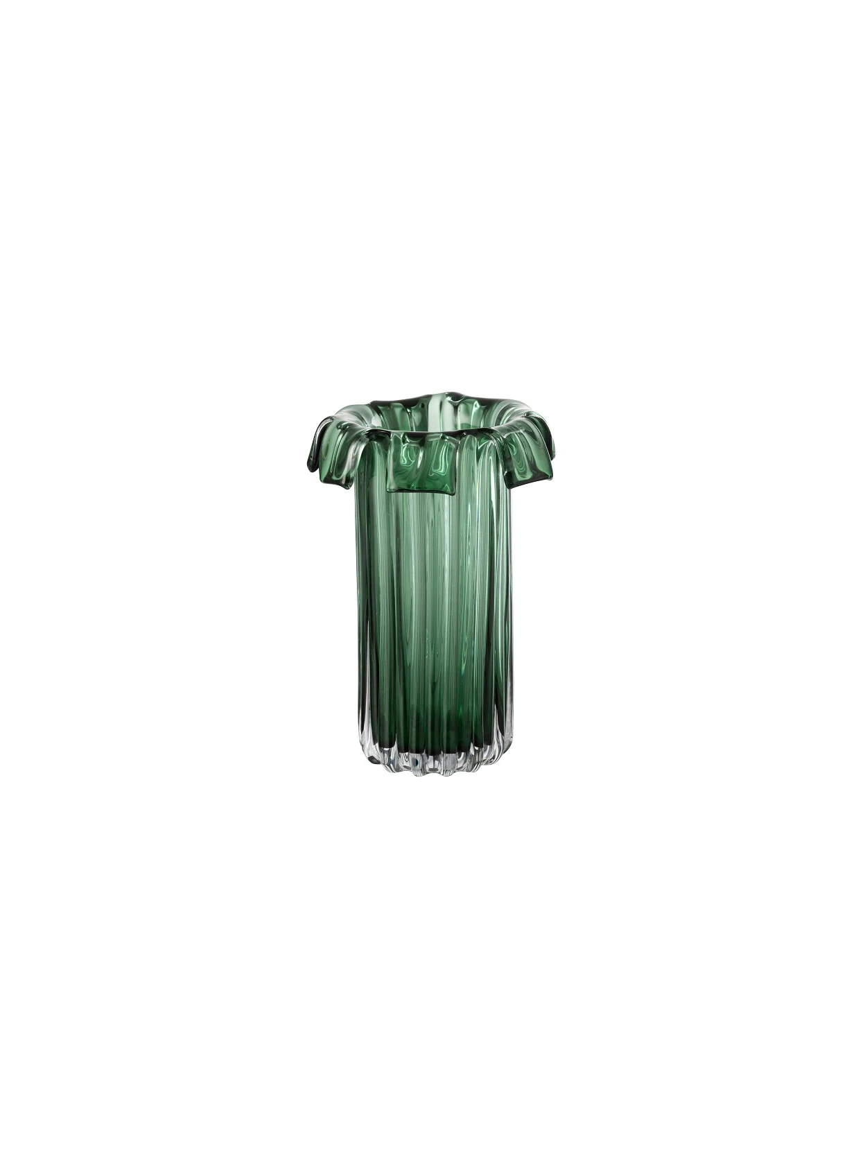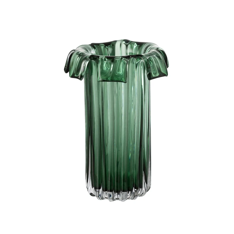 Made of green glass with a wavy edge, this elegant and dramatic vase is ideal for decorating tables, shelves and living rooms with a vintage touch.