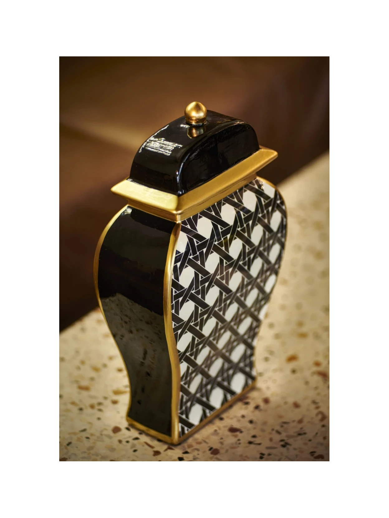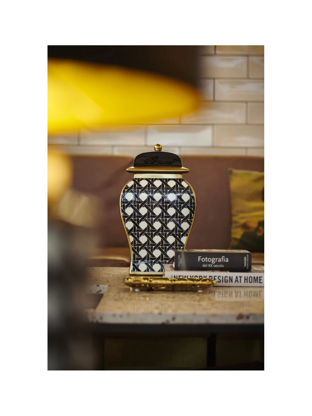 Discover Henriette's 39 cm Vienna Straw potiche, a designer piece that combines classic elegance and contemporary style. Its harmonious silhouette is enhanced by gold finishes and a modern black and white geometric pattern, adding character to any room. Ideal as a decorative element for living rooms, entryways, or sophisticated spaces, this potiche not only captures the eye but also adds a touch of discreet luxury to your home. Perfect for those seeking quality, design, and sophistication in a single object.