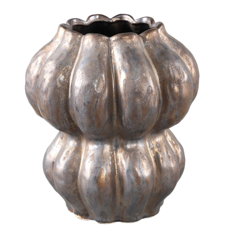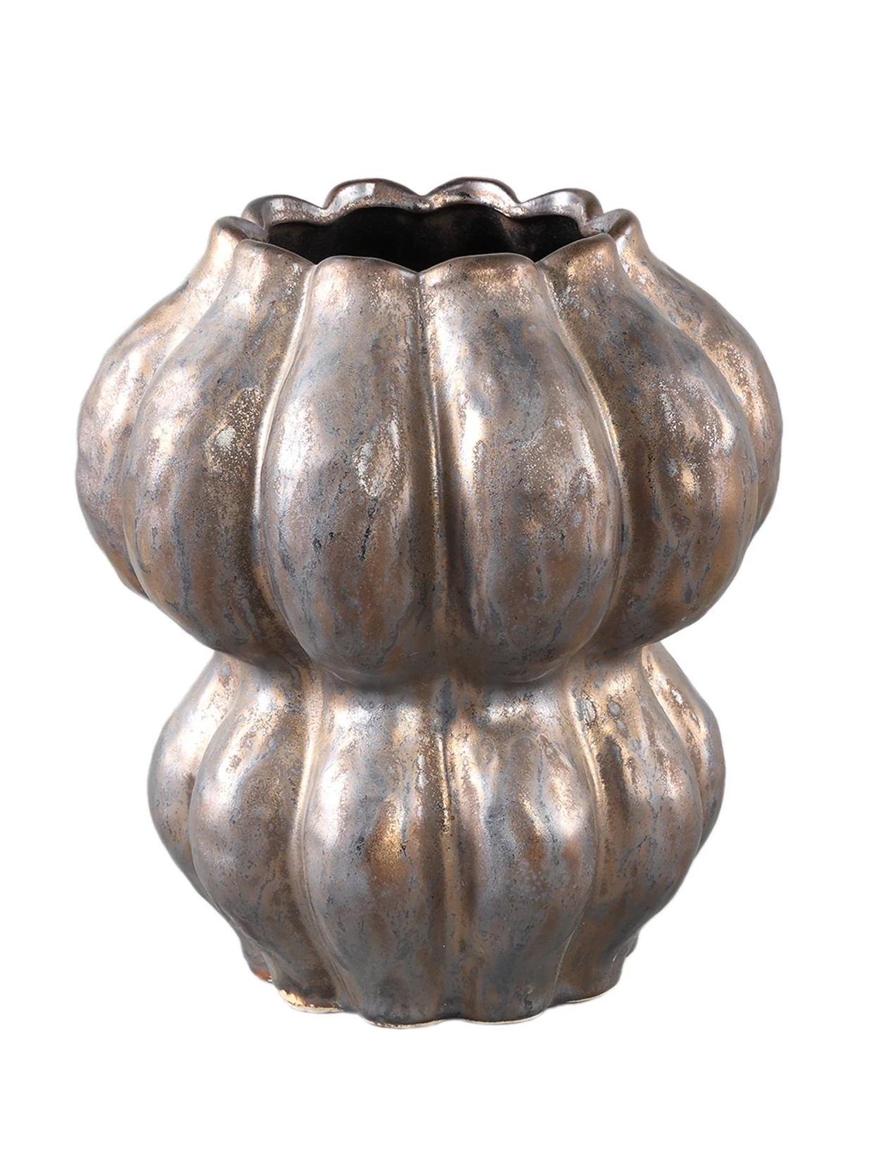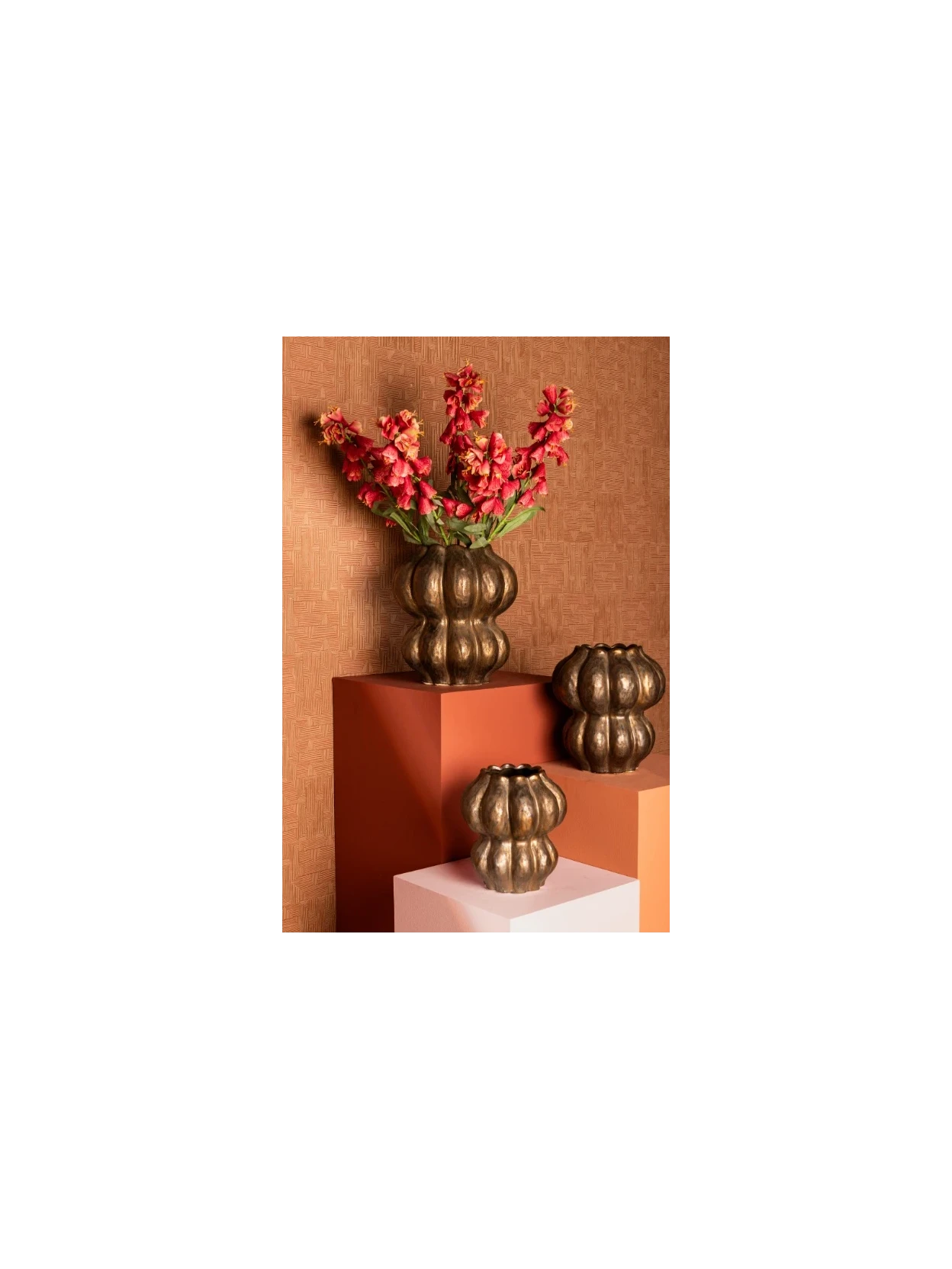 The Niek bronze ceramic vase by PTMD is a refined decorative element that combines craftsmanship and contemporary design. Crafted from handcrafted stoneware, it stands out for its textured surface and lustrous bronze finish, which reflects light and enhances its surrounding space. Measuring 22 x 22 x 25.5 cm, it is perfect for display on coffee tables, shelves, or console tables, either alone or paired with other vases from the PTMD collection. Every detail, from the balanced shape to the irregular texture, expresses the artisanal care and sophisticated style that distinguish the PTMD brand, ideal for those seeking an elegant and timeless furnishing accessory.