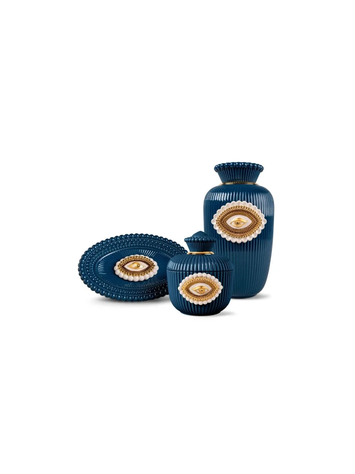 The Lover's Eyes vase in blue porcelain is a refined decorative piece, inspired by the ancient tradition of "lovers' eyes." Crafted from Saxony blue porcelain with white details and gold accents, this vase combines elegance, history, and contemporary design. An iconic piece that captures the eye and enhances any space.