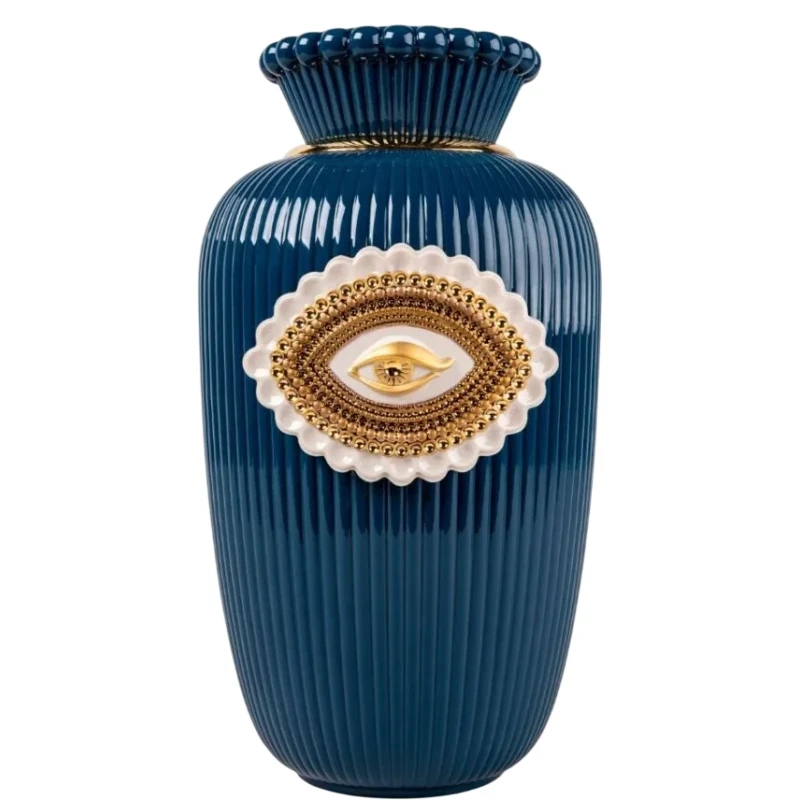 The Lover's Eyes Vase is a porcelain design that brings the romantic allure of an 18th-century tradition into the present: miniature "lovers' eyes," symbols of secret devotion and profound complicity. The delicately engraved eye on the vase's surface recalls these mysterious love stories, transforming them into a mesmerizing decorative element capable of enhancing any space. The color combination of white porcelain, intense Saxony blue, and golden highlights gives the piece a sophisticated and luminous presence, ideal for those seeking a decorative object that is simultaneously artistic, elegant, and highly distinctive.