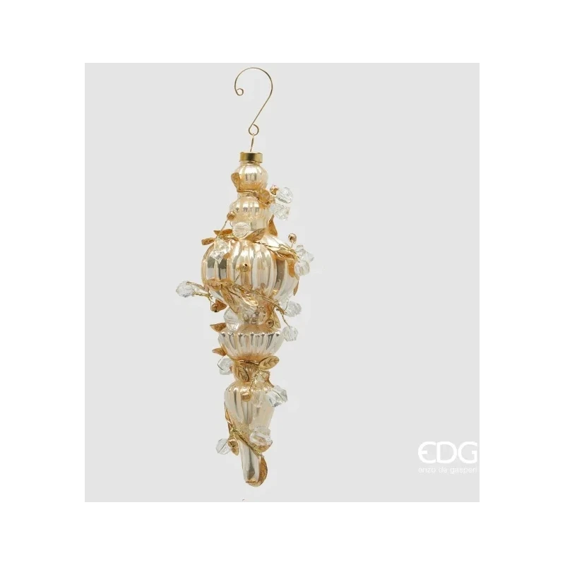 Addobbo natalizio fuso barocco in vetro dorato, disponibile in 4 eleganti modelli assortiti, altezza 24 cm. Perfetto per decorazioni raffinate e scintillanti.