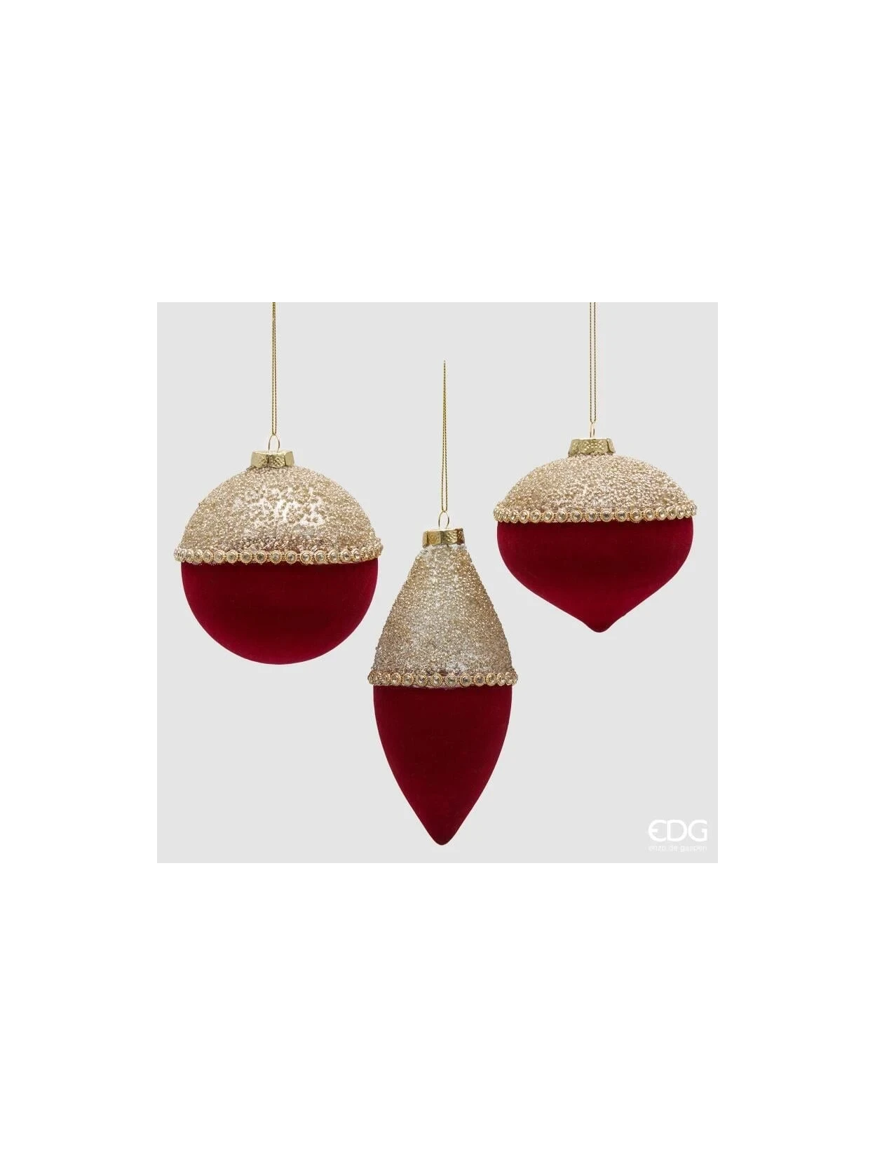 Rendi il tuo Natale scintillante con questi raffinati addobbi in vetro bicolore. Ogni pezzo unisce la brillantezza della parte superiore oro decorata con glitter e microperline all’intensità del rosso della parte inferiore, creando un effetto elegante e prezioso. Disponibili in 3 forme assortite (palla, trottola e fuso), questi ornamenti (H.17 cm, D.10 cm) riflettono la luce con giochi di bagliori dorati e accenti rossi che doneranno al tuo albero un fascino sofisticato e festoso. Perfetti per chi desidera un Natale luminoso, elegante e ricco di dettagli unici.