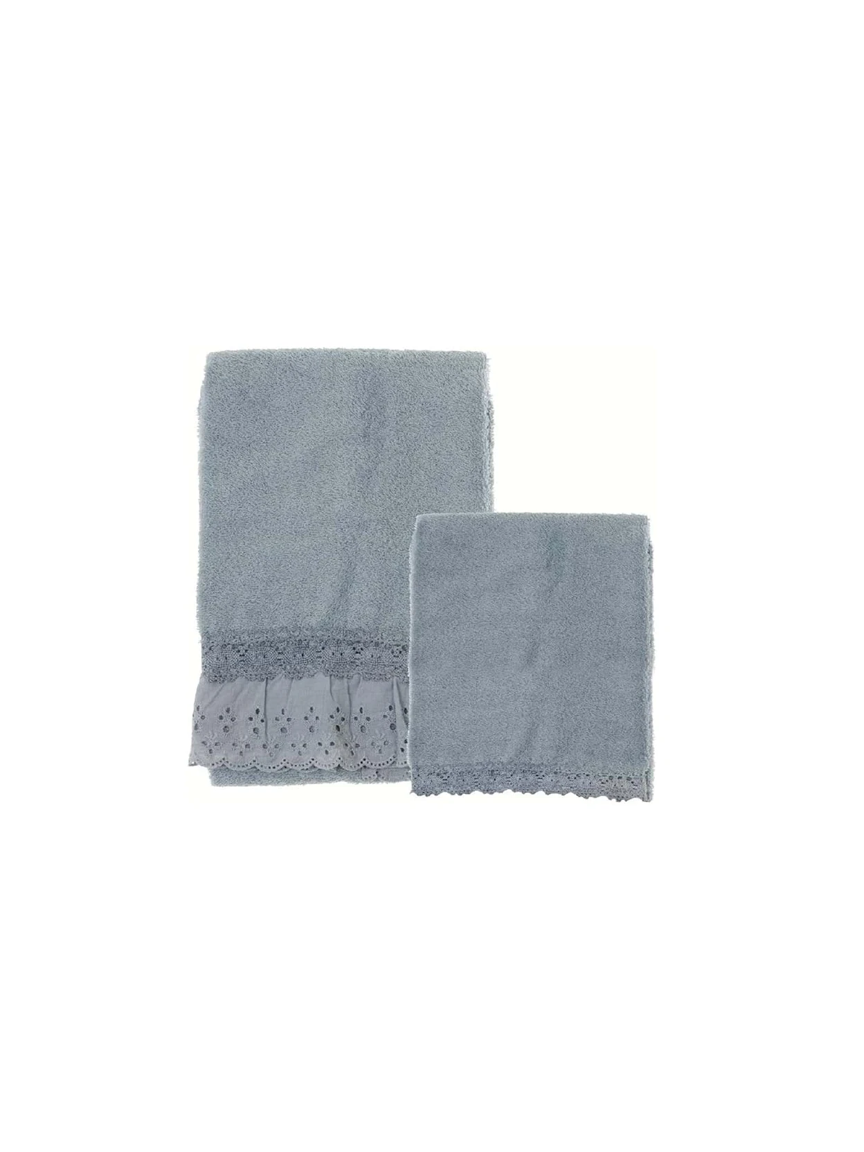 Elegante coppia di asciugamani in 100% cotone con balza. Morbidi e confortevoli sono arricchiti da un raffinato pizzo Sangallo in tinta.