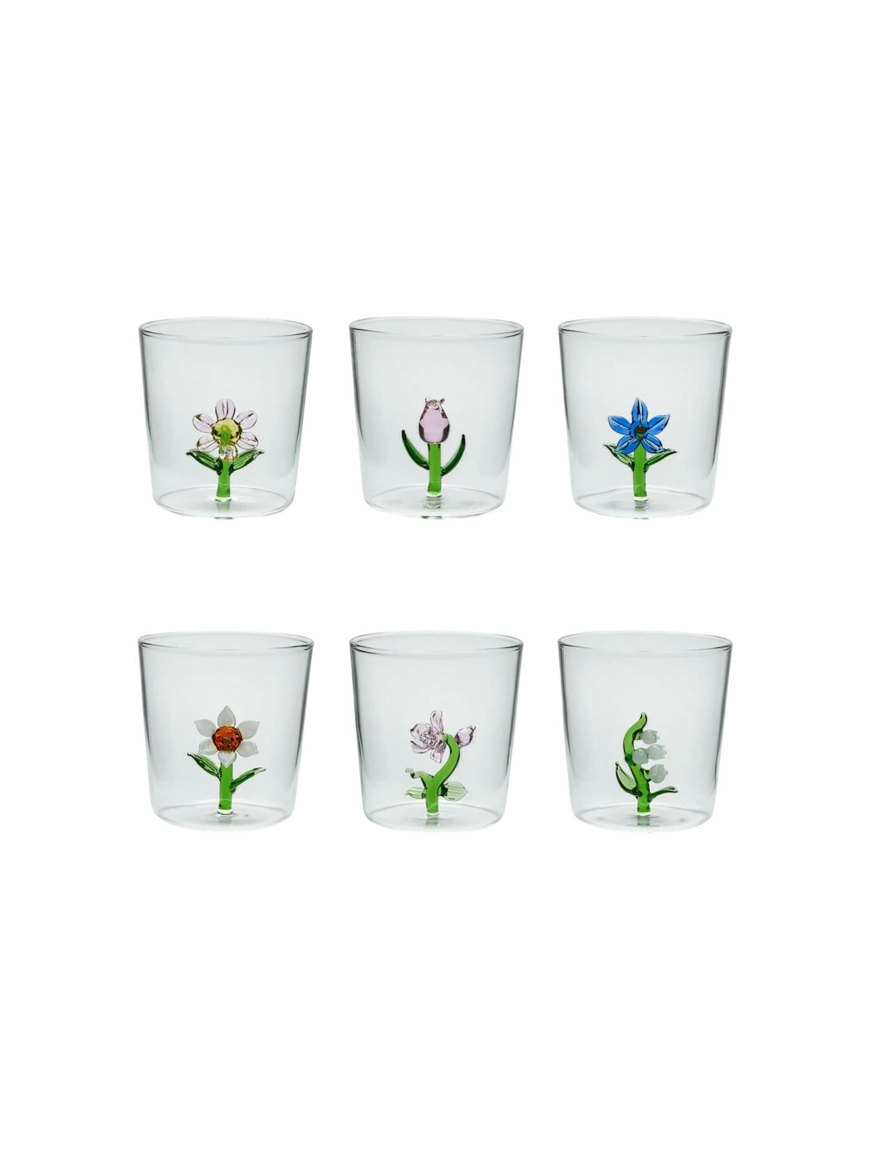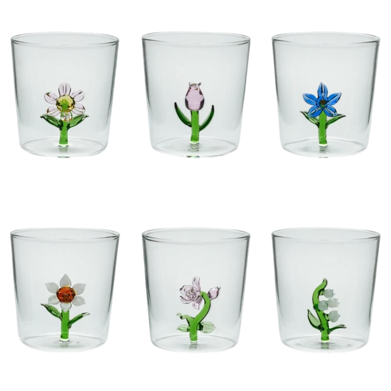 Set di 6 bicchieri in borosilicato trasparente con fiorellini colorati all’interno. Resistenti, leggeri e lavabili in lavastoviglie: un tocco di allegria per la tua tavola.