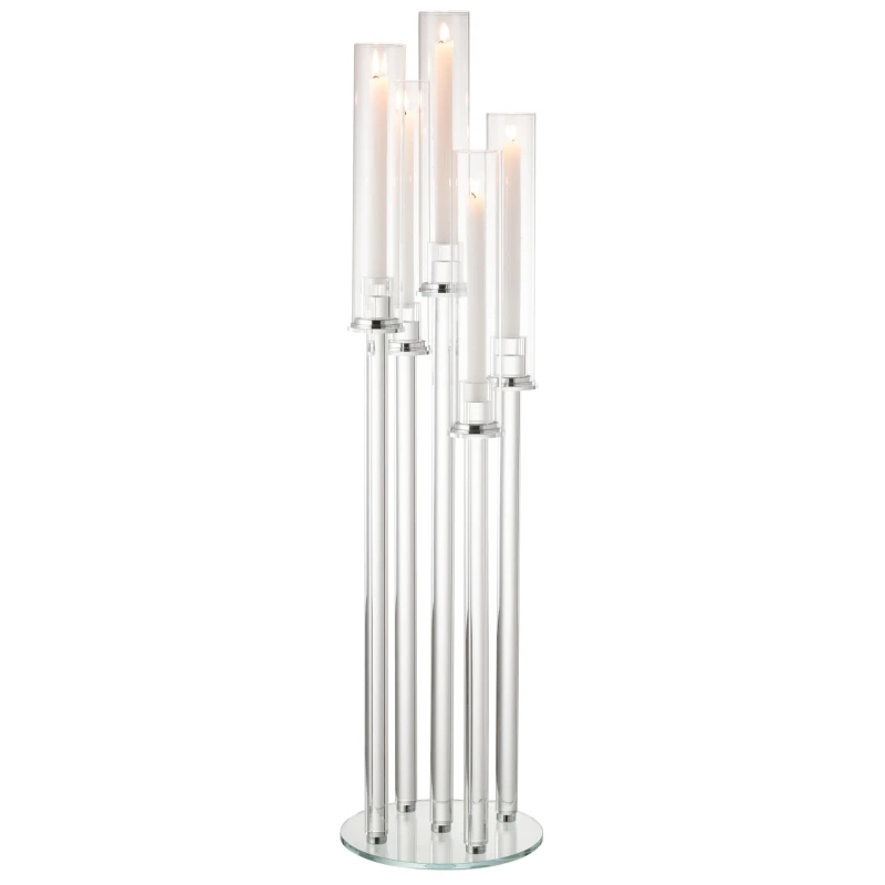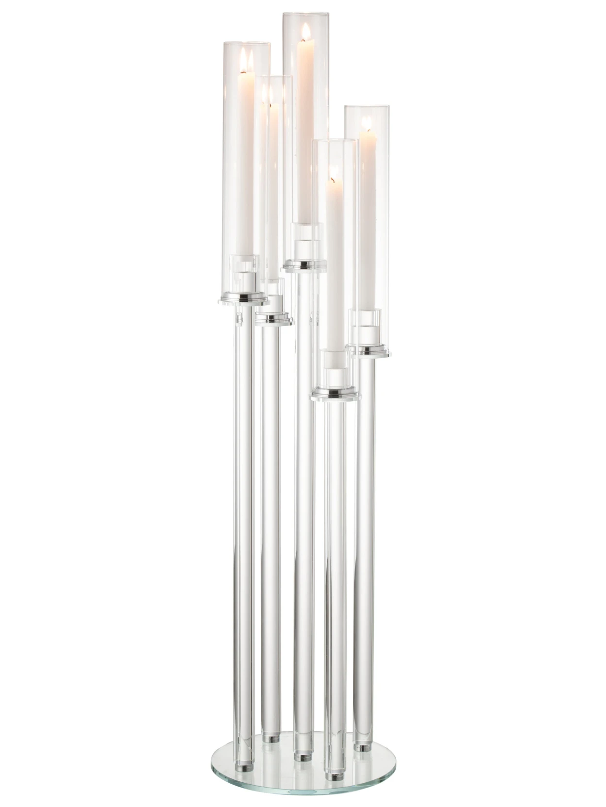 Elegante portacandela da terra realizzato in vetro, con 5 bracci sottili. Altezza 100 cm, base Ø 25 cm. Design raffinato, perfetto per interni di classe.