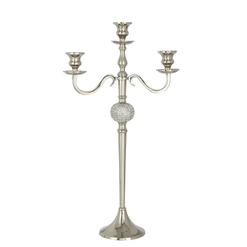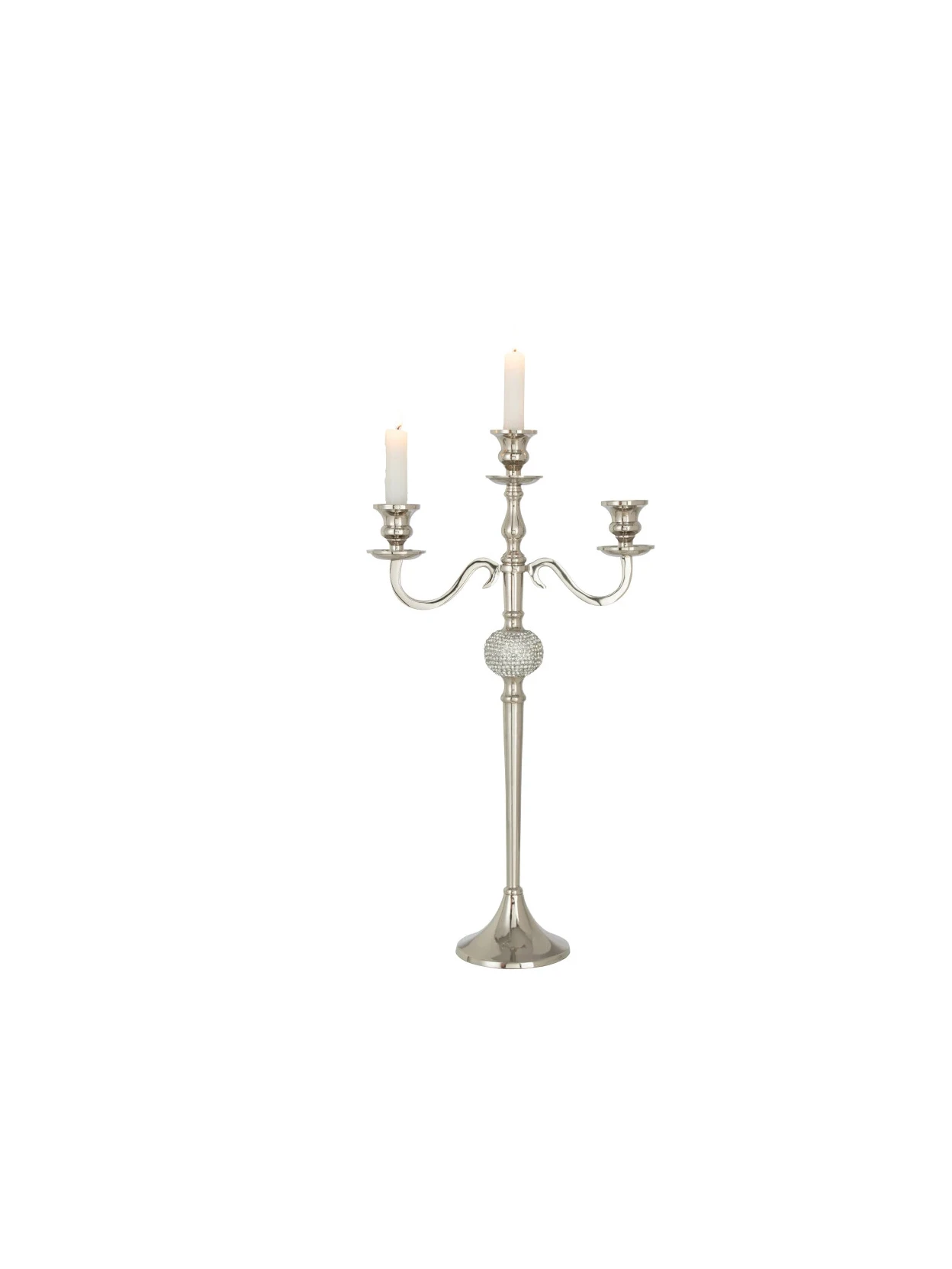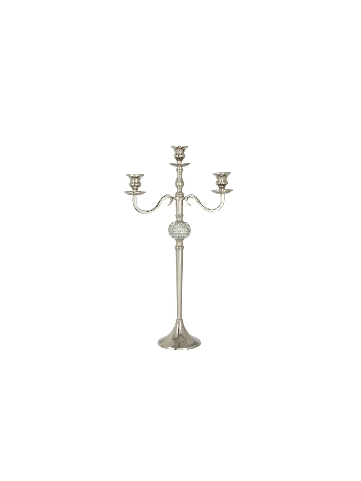 Candelabro a 3 braccia in alluminio argento con palla centrale di diamantini, altezza 56 cm. Elegante e scintillante, perfetto per illuminare e decorare con stile gli ambienti.