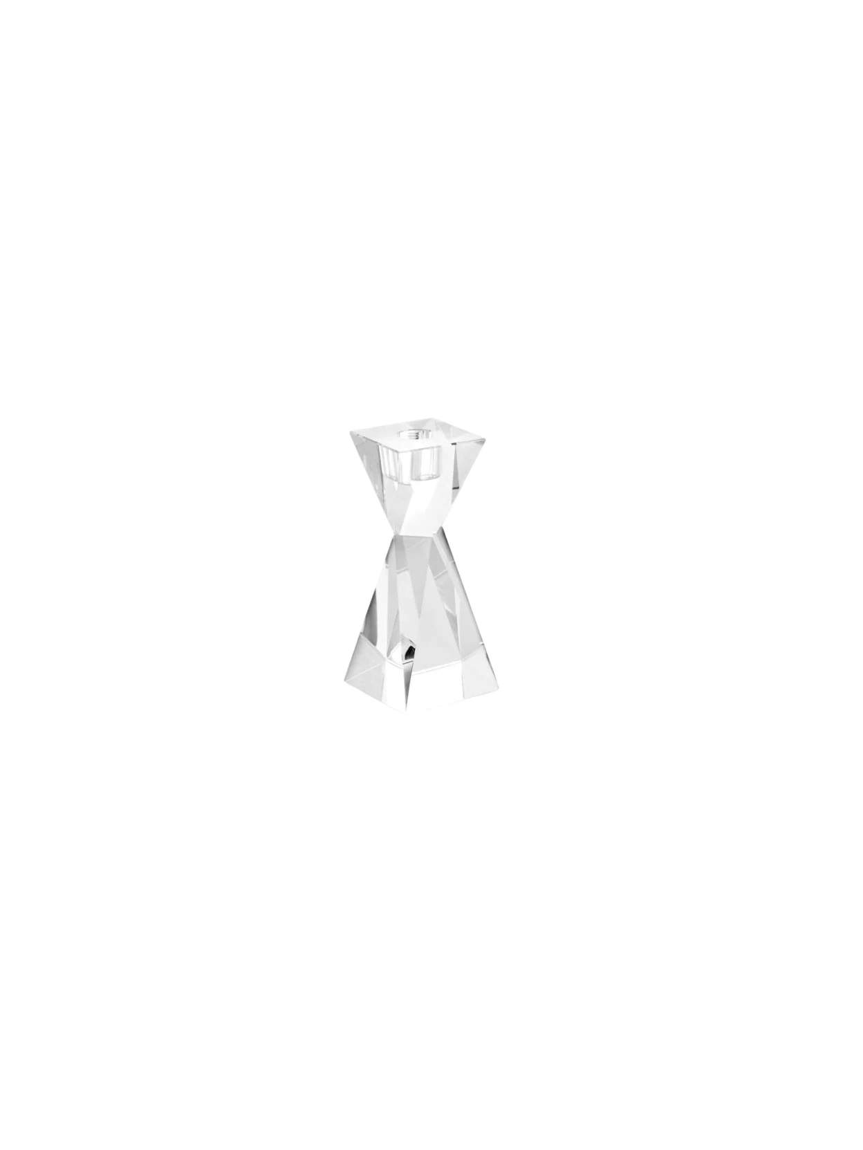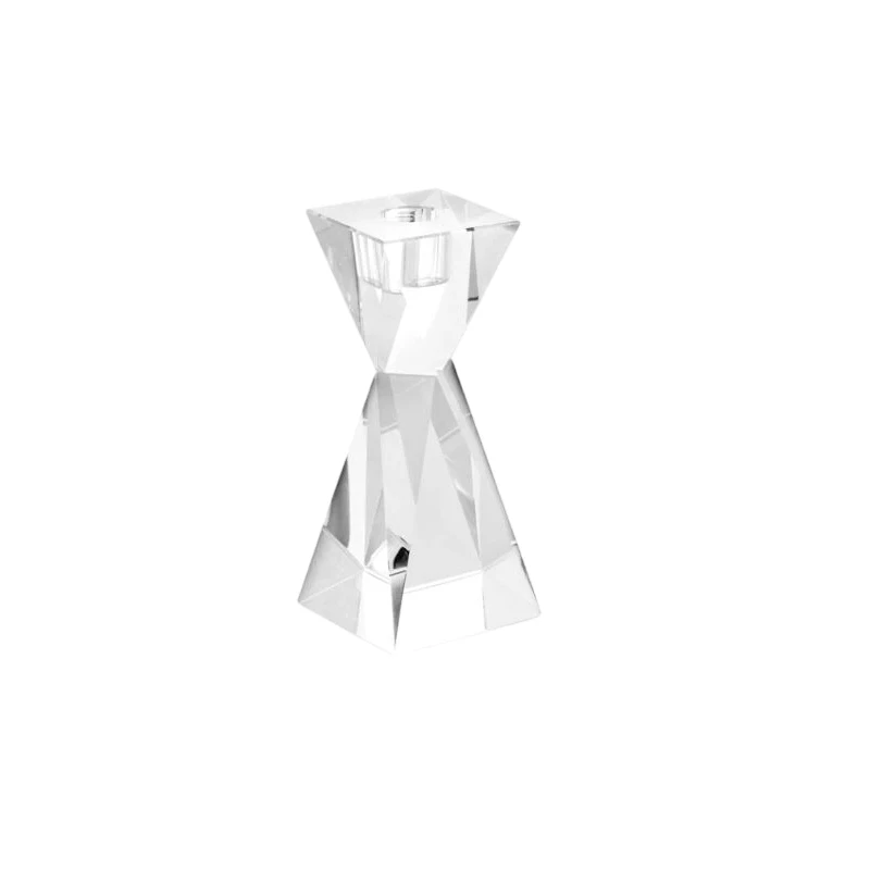 Candeliere a forma di piramide in cristallo di Ottaviani, elegante e luminoso, disponibile in tre altezze: h 16 cm, h 21 cm e h 26 cm. Un tocco di design raffinato per ogni ambiente.