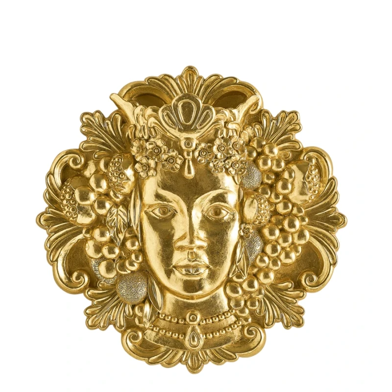 La decorazione da muro iMori di Henriette, proposta in una raffinata versione femminile e realizzata in resina dorata, appartiene alla collezione Mediterranea. Rappresenta al meglio l’eleganza e il carisma senza tempo della tradizione siciliana.