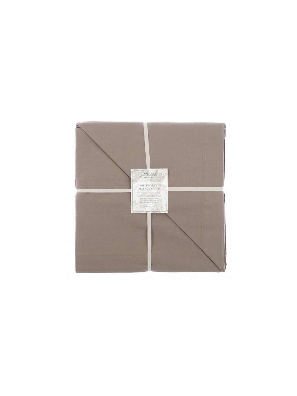 Set completo per letto matrimoniale con copriletto 245x300 cm, lenzuolo 180x200 cm e 2 federe 50x80 cm. Realizzato in 100% cotone italiano (Made in Italy), combina morbidezza, qualità e stile naturale in un elegante colore fango.