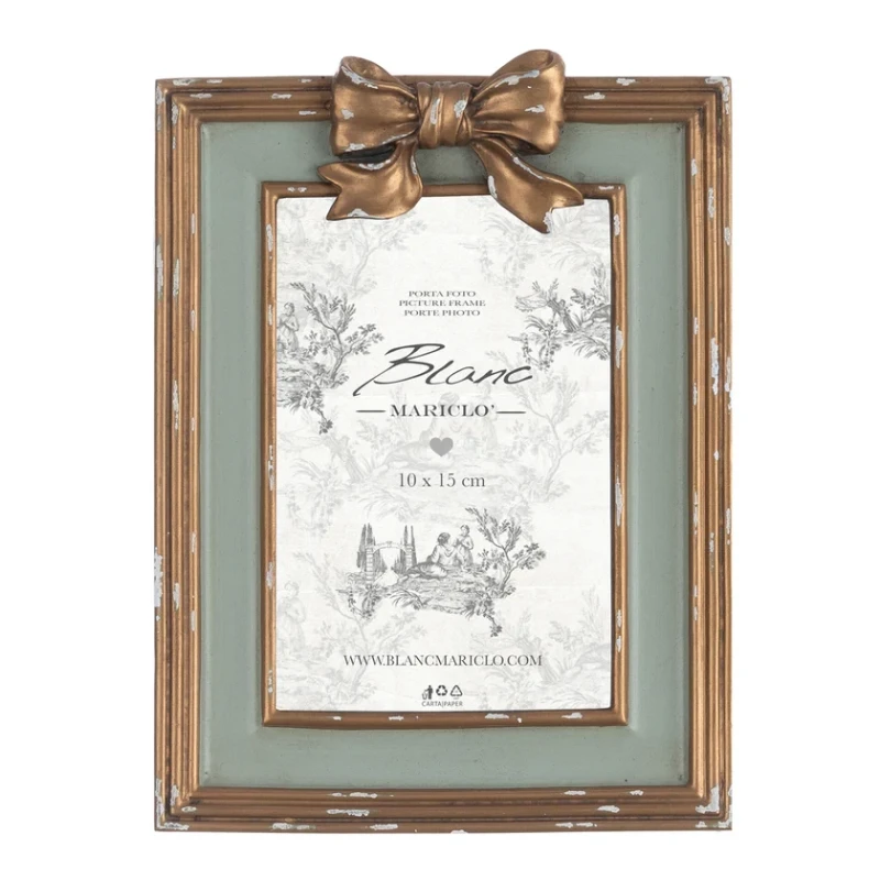 Raffinato portafoto in resina effetto anticato con fiocco decorativo, appartenente alla collezione Amor et Memoria. Disponibile nei formati 10x15 cm e 13x18 cm, è perfetto per custodire e valorizzare i tuoi ricordi con un tocco romantico e vintage.