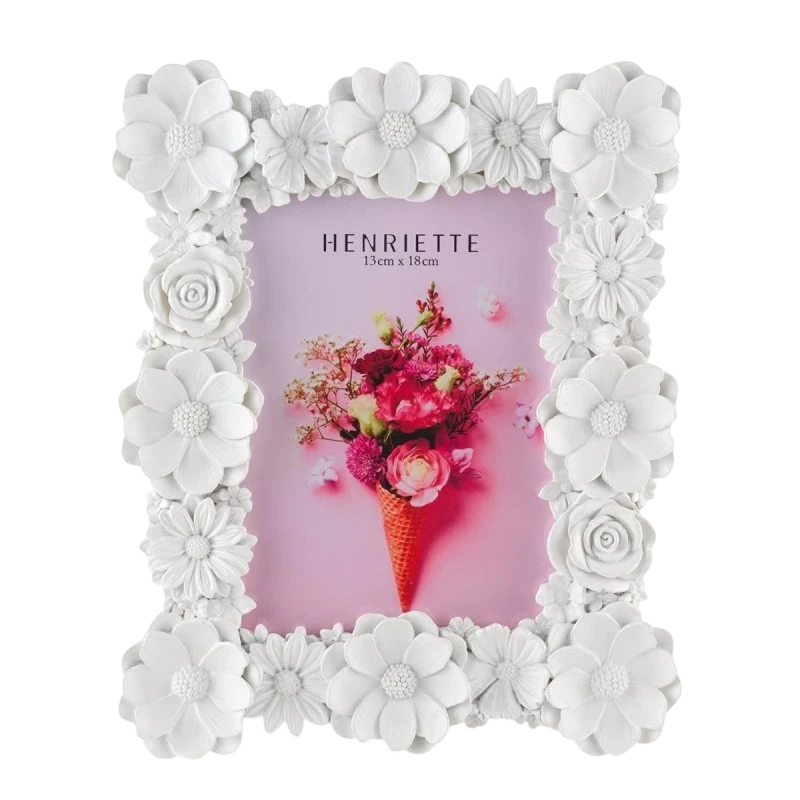 Cornice Flowers Ostuni di Henriette in resina bianca dipinta a mano, impreziosita da delicati motivi floreali. Disponibile nei formati 13x18 e 20x25 cm. Elegante e romantica, perfetta per decorare ogni ambiente.