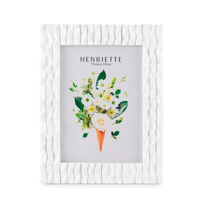 Cornice Ondine Ostuni di Henriette in resina bianca dipinta a mano. Elegante finitura ondulata e design raffinato per esporre i tuoi ricordi con stile. Disponibile nei formati 13x18 e 20x25 cm.