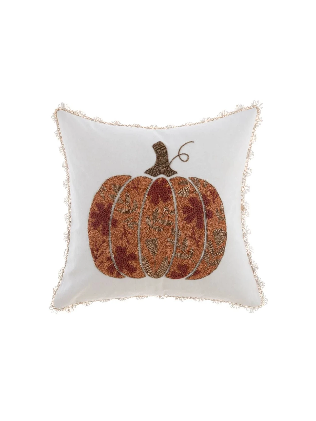 Elegante cuscino autunnale in misto tessuto (70% cotone, 30% fibra sintetica) con ricamo in rilievo di zucca e foglie impreziosito da perline. Fondo panna e profilo dorato per un tocco raffinato. Perfetto per divani, poltrone o letti in stile country chic.
