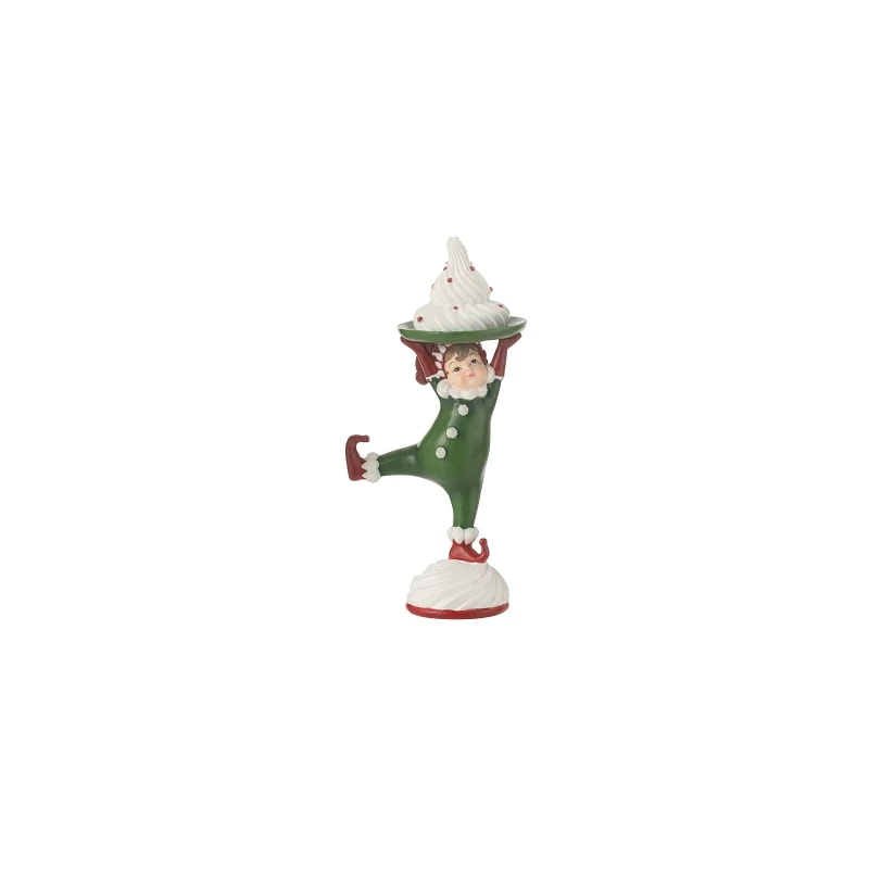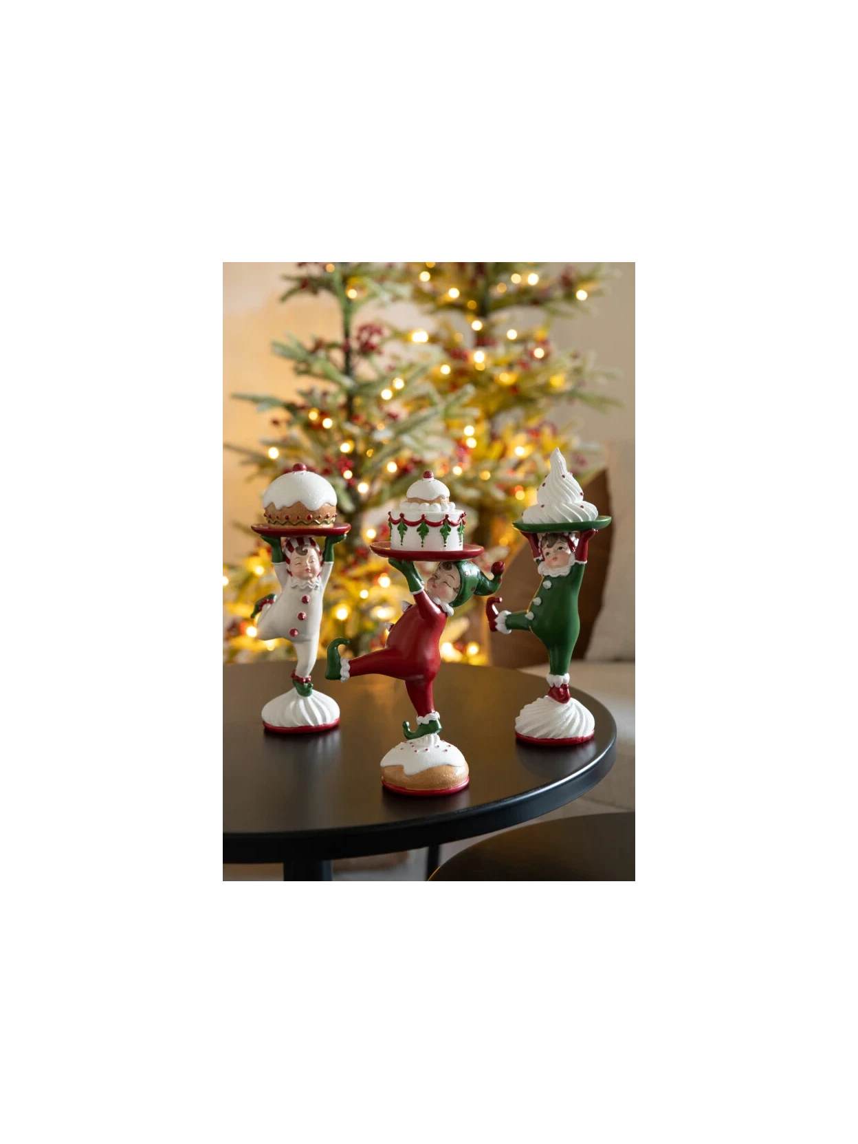 Elfo pasticcere in resina con dolci natalizi. Disponibile in tre varianti di colore: rosso, verde e bianco. Decorazione allegra e festosa.