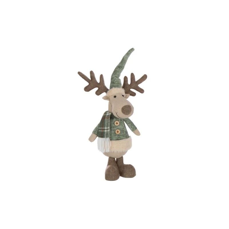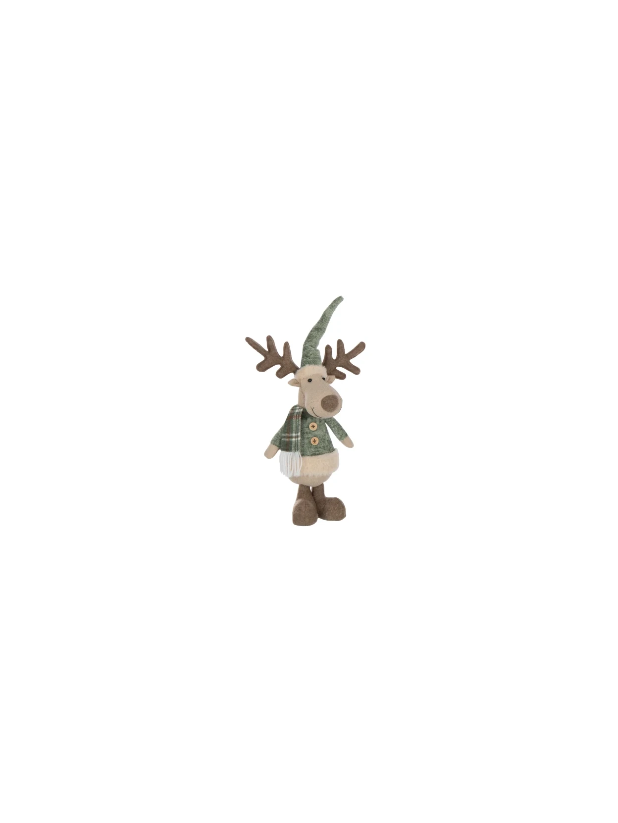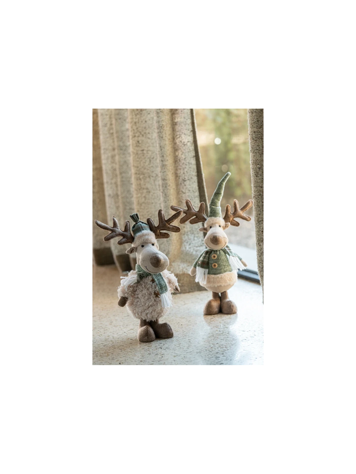 Alce natalizio in tessuto con sciarpa, disponibile in due varianti (A e B) nei toni avorio e verde. Decorazione morbida e festosa.
