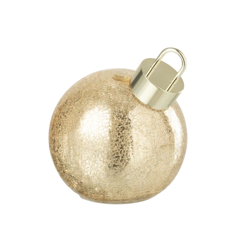 Pallina di Natale da tavolo realizzata in vetro oro con luce LED integrata. Elegante e luminosa, disponibile in tre misure: piccola, media e grande.
