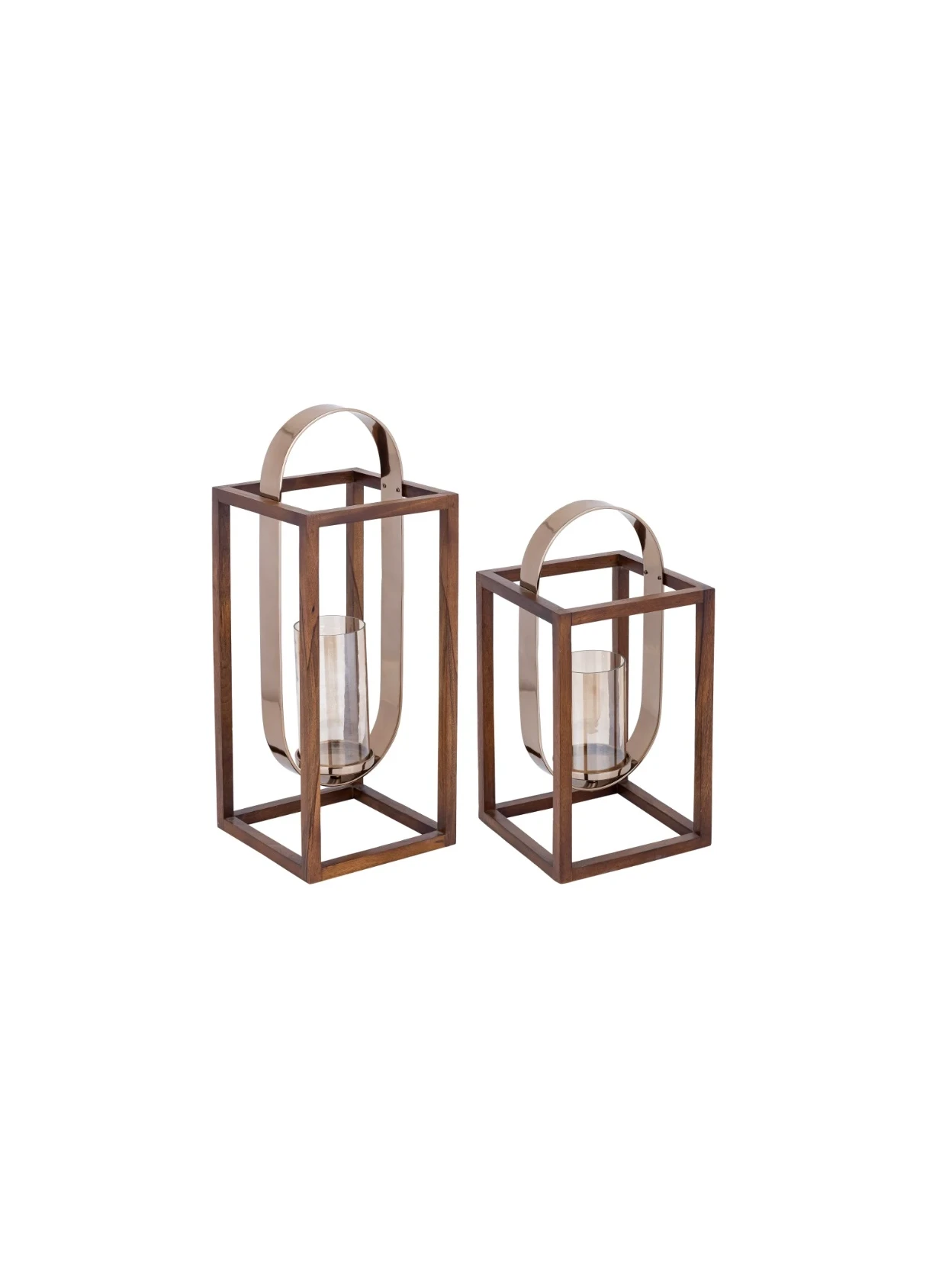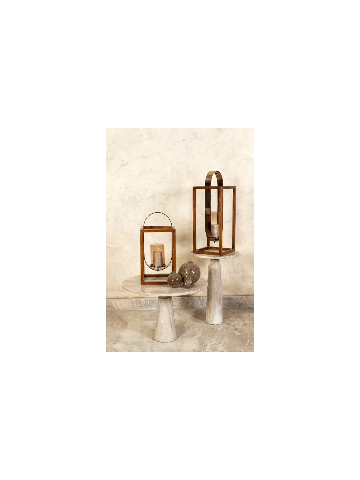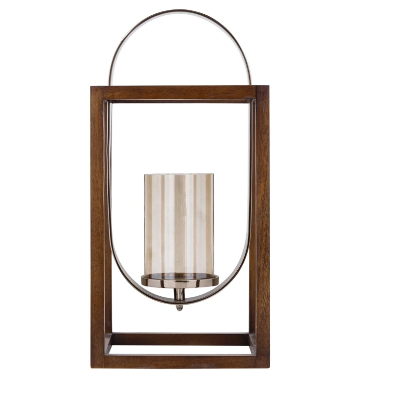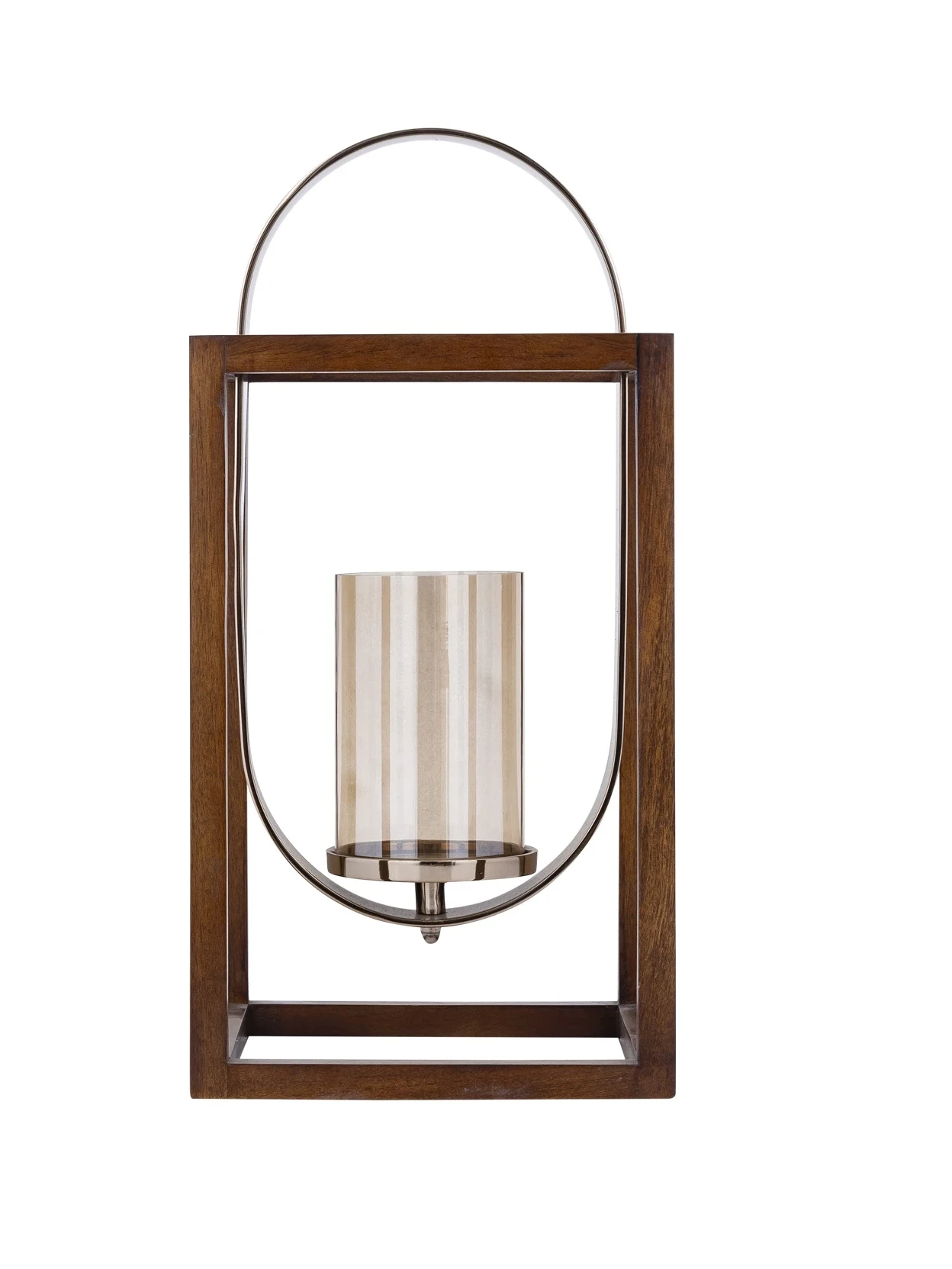 La lanterna Shirah di PTMD in marrone combina vetro, metallo e legno di mango per un design artigianale e sofisticato. Disponibile in due altezze, è perfetta per creare atmosfera in ogni ambiente.