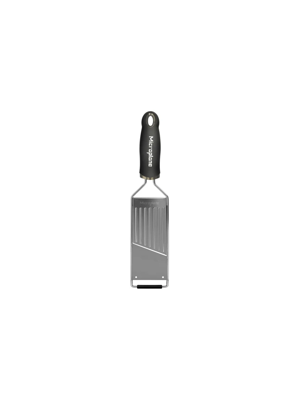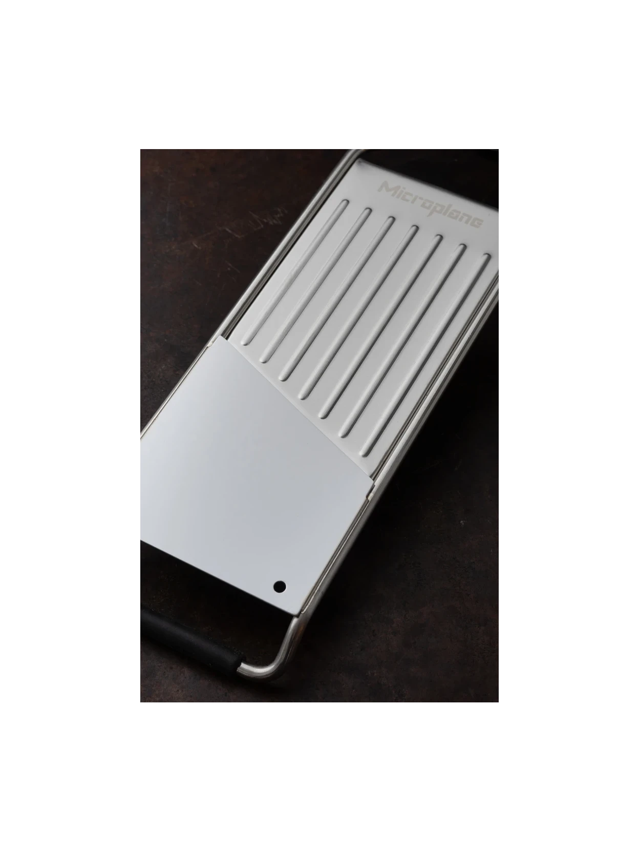 La Mandolina Gourmet di Microplane in colore nero offre un taglio preciso e uniforme grazie alla lama in acciaio inossidabile affilata come un rasoio. Perfetta per affettare rapidamente cetrioli, zucchine, patate, cipolle, mele e molte altre verdure o frutti con uno spessore costante di 2 mm. Compatta, ergonomica e stabile, è ideale per preparazioni veloci e professionali in cucina.