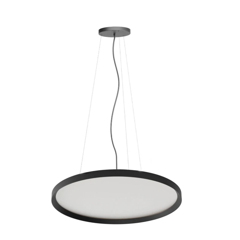 Lampada a sospensione  LED con struttura in alluminio pressofuso e metallo verniciato a polveri in finitura nero opaco e diffusore microprismatico in policarbonato.