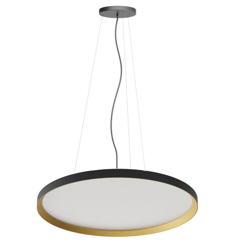 Dama di Redo Group è una lampada a sospensione LED composta da un rosone tondo per fissaggio a soffitto, cavi in acciaio e cover copricavi con struttura in metallo nero opaco. Il diffusore LED è disponibile in versione non dimmerabile, dimmerabile DALI o dimmerabile TRIAC, e consente la regolazione della temperatura colore (3000K / 4000K / 5000K). Corpo in alluminio pressofuso verniciato a polveri nero opaco esternamente e in finitura oro internamente, diffusore microprismatico in policarbonato con UGR<19. Elevata resa luminosa (5631 lm), CRI>90, classe energetica E, IP20.