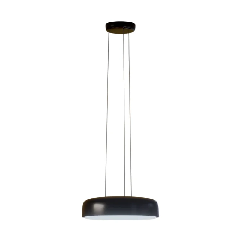 Lampada a sospensione LED con struttura in metallo verniciato in finitura nero lucido e diffusore in polipropilene bianco opalino.