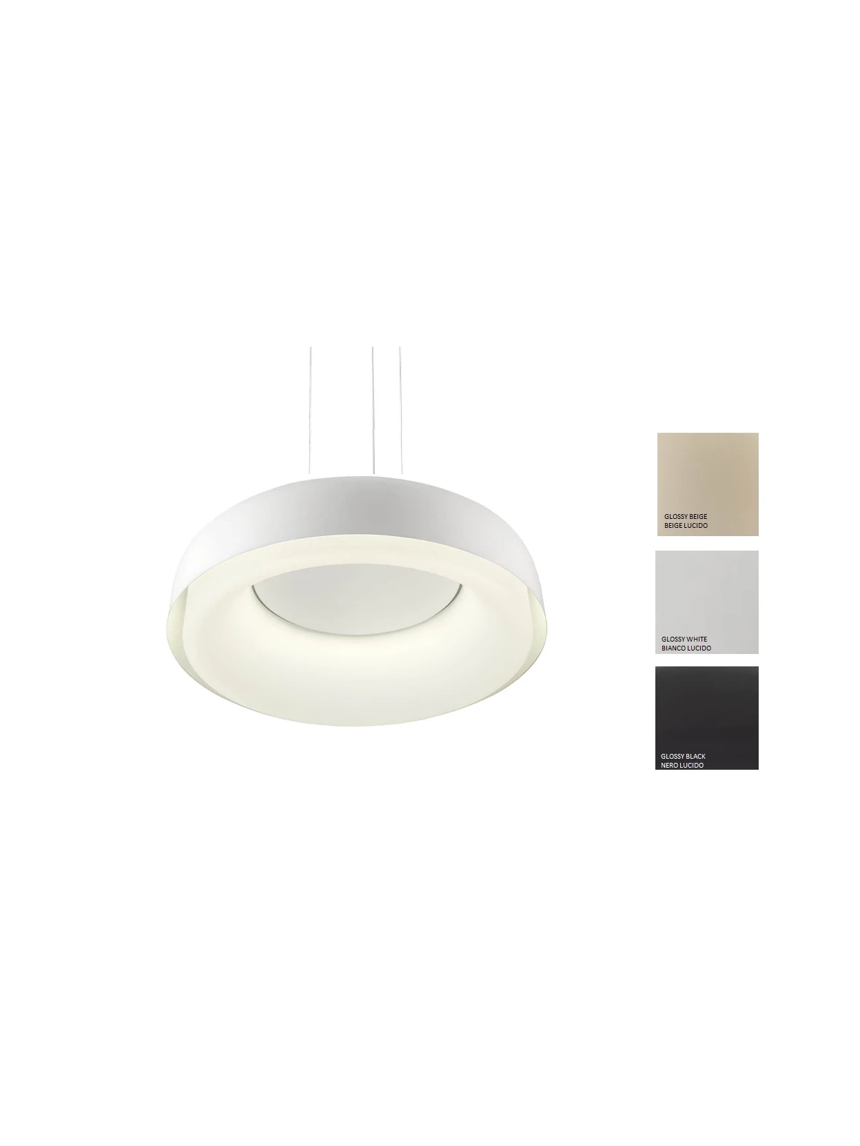 Lampada a sospensione LED con struttura in metallo verniciato in finitura bianco lucido e diffusore in polipropilene bianco opalino.
